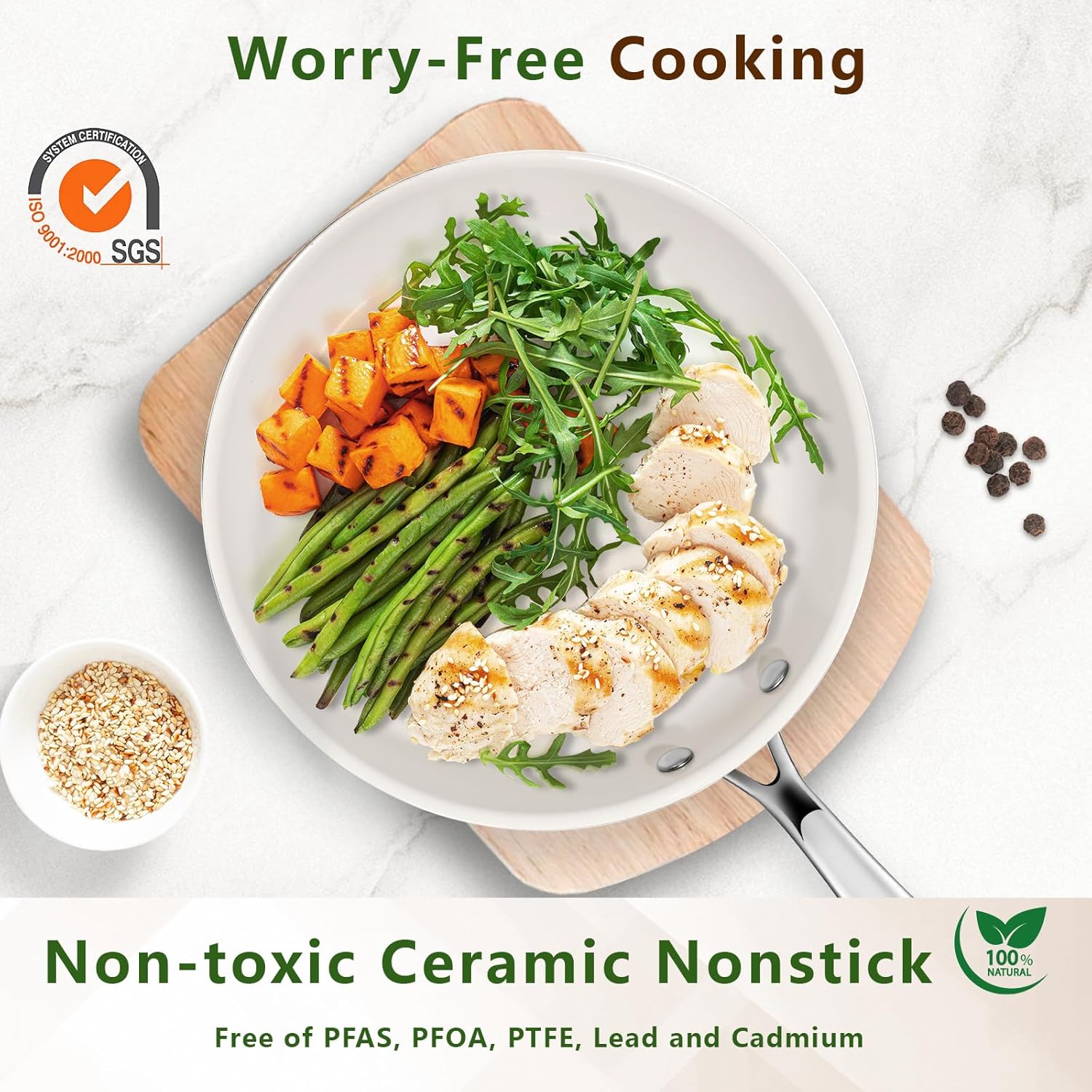 Advanced Ceramic Nonstick Coating: Enjoy effortless cooking with our premium PFOA-, PTFE-, and PFAS-free ceramic coating, rigorously tested and SGS-certified non-toxic. Designed for healthier frying, our pan requires minimal oil and reduces smoke, keeping your meals safe. For best results, use low to medium heat to preserve the coating’s nonstick properties.