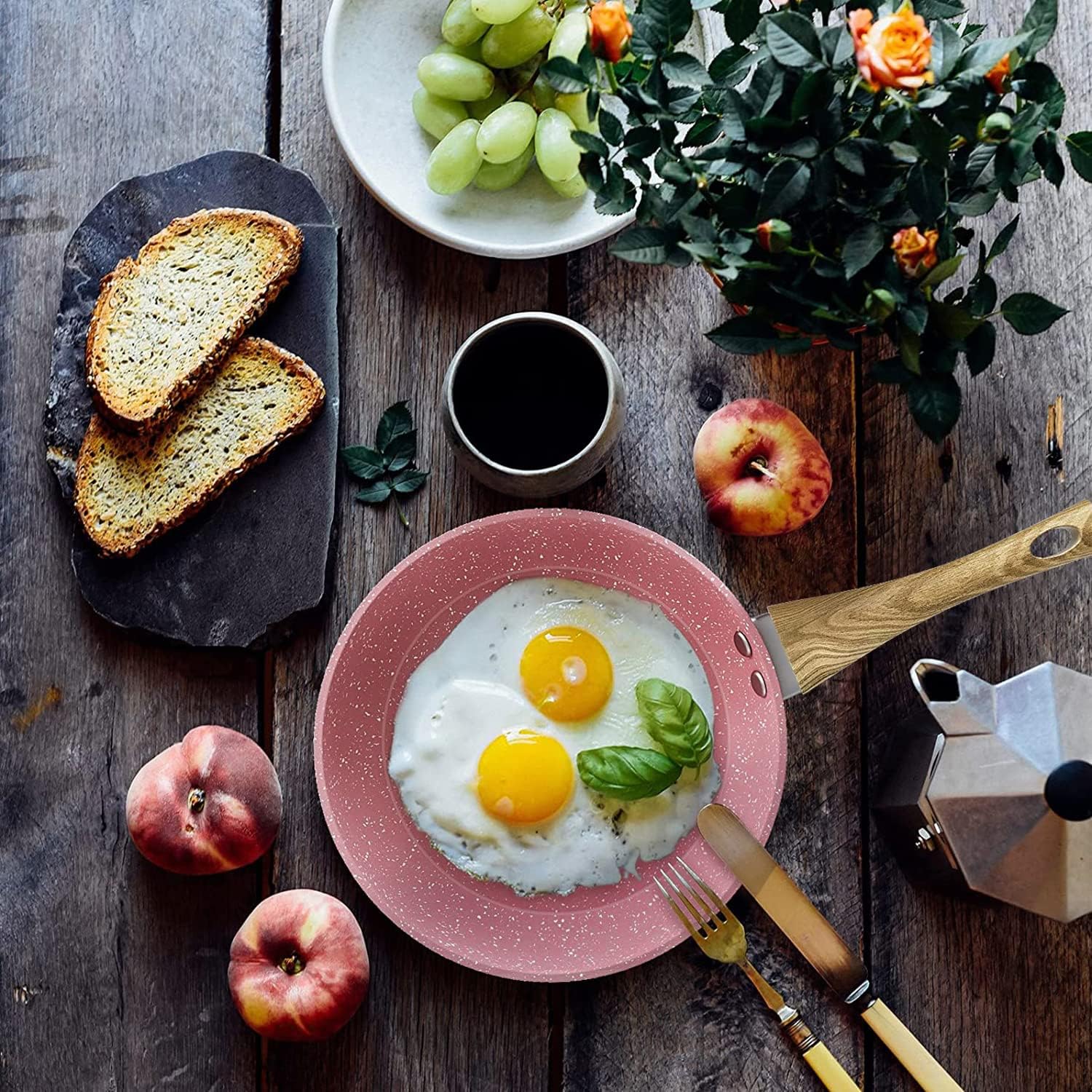 【Ultra Nonstick Coating】Innerwell eye-catching pink speckled textured granite nonstick coating, Toxin-free, Without containing any harmful substances such as PFOA, PFOS, PTFE, CHROMIUM, etc. Ideal for cooking with less oil and delivering the ultimate food release.