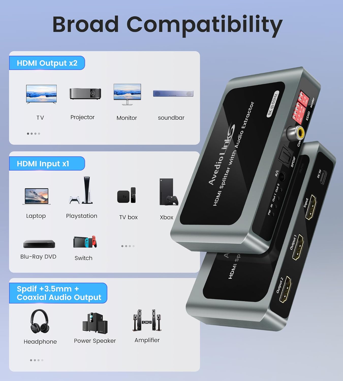 Simultaneous 2 HDMI Output & Audio Extraction: Mirror 1 HDMI source to 2 TVs while extracting audio via 3.5mm, Coaxial, or Optical SPDIF. Perfect for connecting a soundbar or AV receiver to enjoy immersive home theater sound in different rooms.