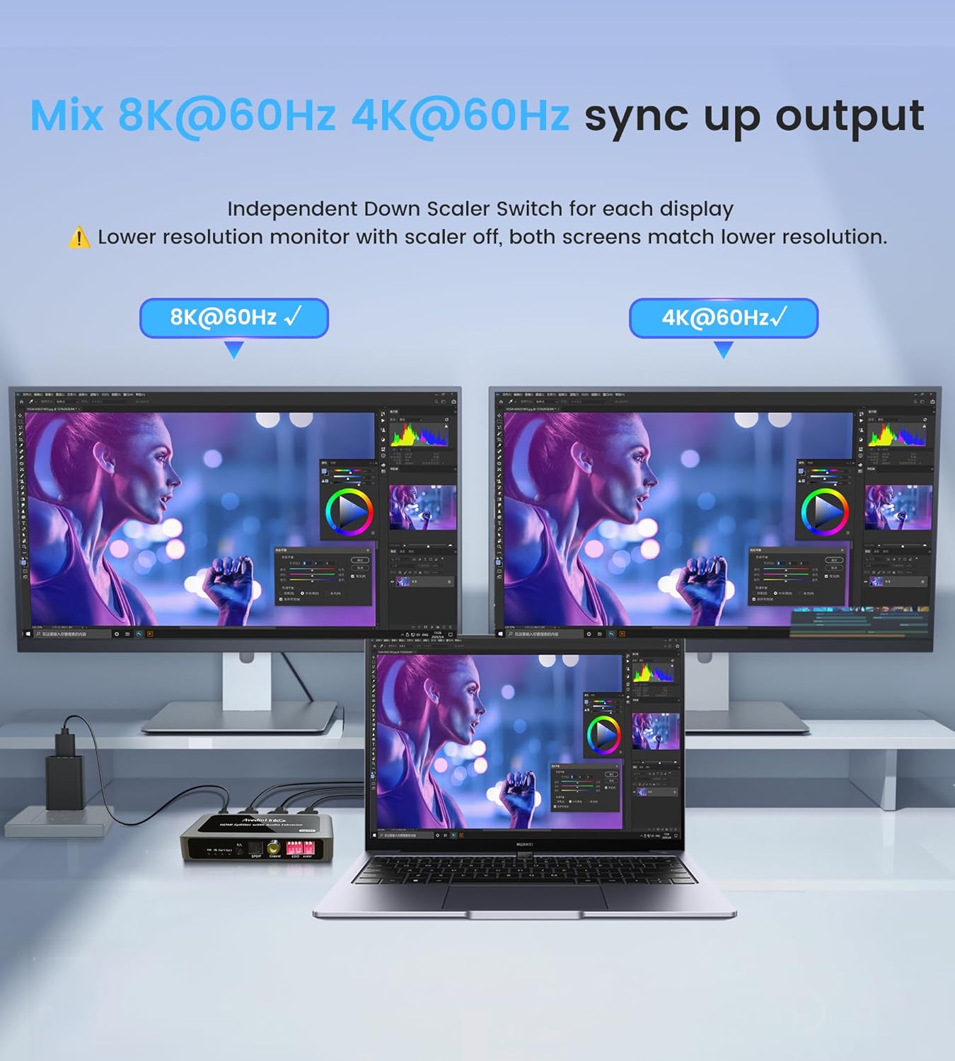 Crisp UHD & Ultra-Wide Visuals: Supports 8K@60Hz, 4K@120Hz, 2K@75-144Hz, 1080P@60-480Hz, HDR 10+, and ultra-wide formats like 7680×1200@60Hz (≤48Gbps). Independent scaler switches let 8K and 4K screens work together—perfect for mixing-resolution setups.