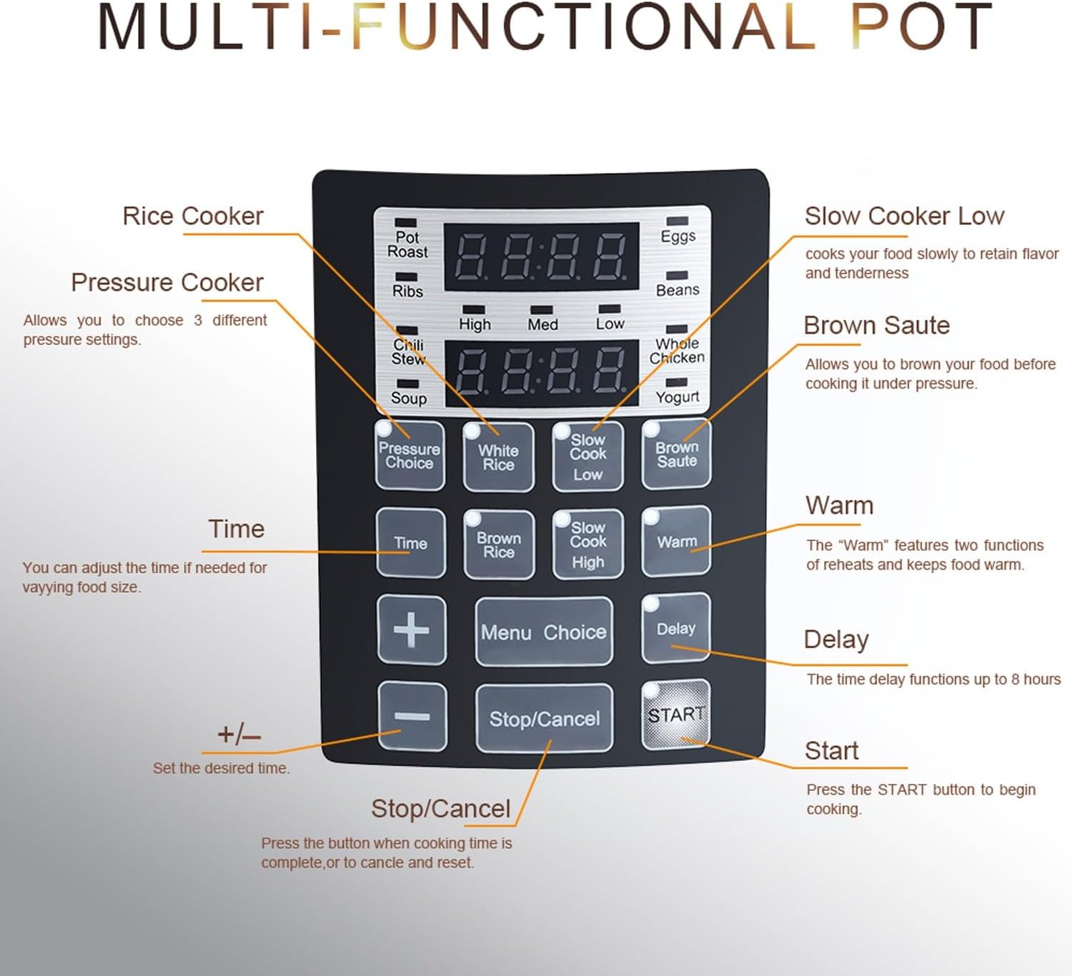 16 Smart Programs : Pressure Cook, Pot Roast, Ribs, Whole chicken, Chili/Stew, Soup, White Rice, Brown Rice, Beans, Egg, Yogurt, Slow Cook Low, Slow Cook high, Sauté/Brown, Reheat, Keep Warm; No need for cumbersome operations, just a few simple steps to cooking delicious food