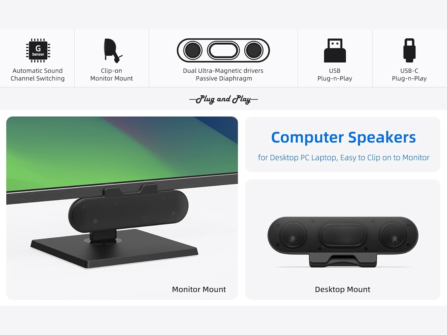 [AUTO CHANNEL SWITCHING] — It is built with a gravity sensor that can actively identify whether the speaker is clamped to the top or bottom of the monitor, and then automatically switch the left and right sound channels. This allows you to enjoy a more immersive stereo effect when watching movies with stereo sound.