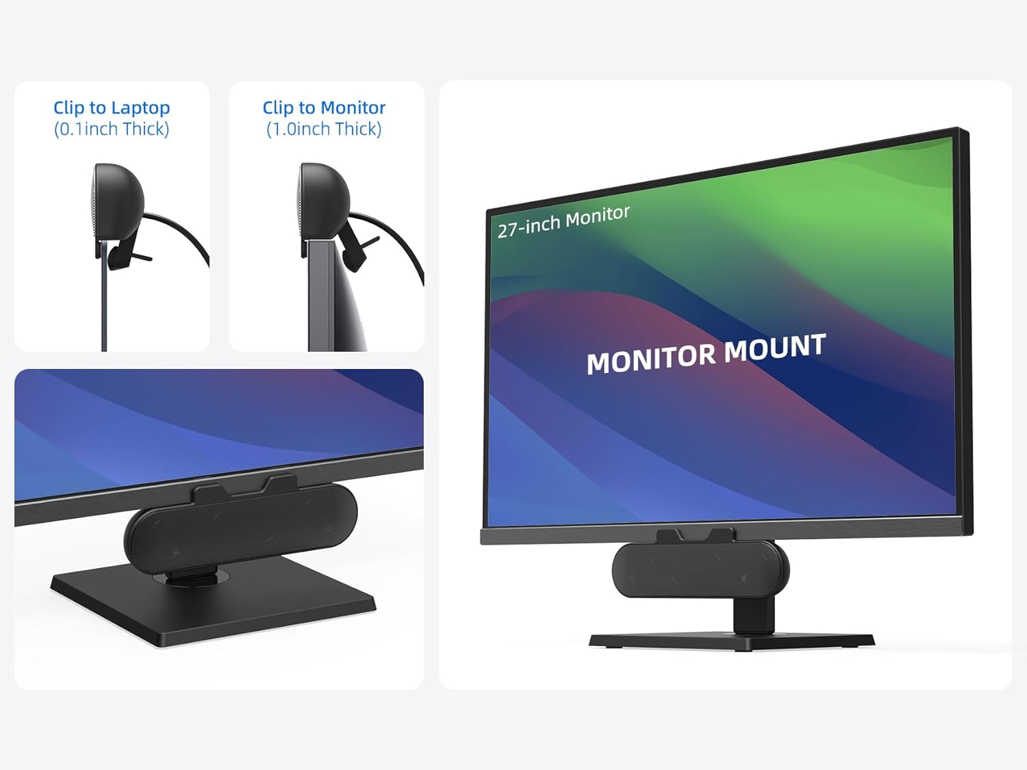 [EASY MONITOR MOUNT] — The clamp of our speaker has undergone dozens of optimization improvements. It can firmly clip onto monitors with a thickness of 0.1 to 1 inch. Even when the speaker is at maximum volume, there will be no shaking or noise.