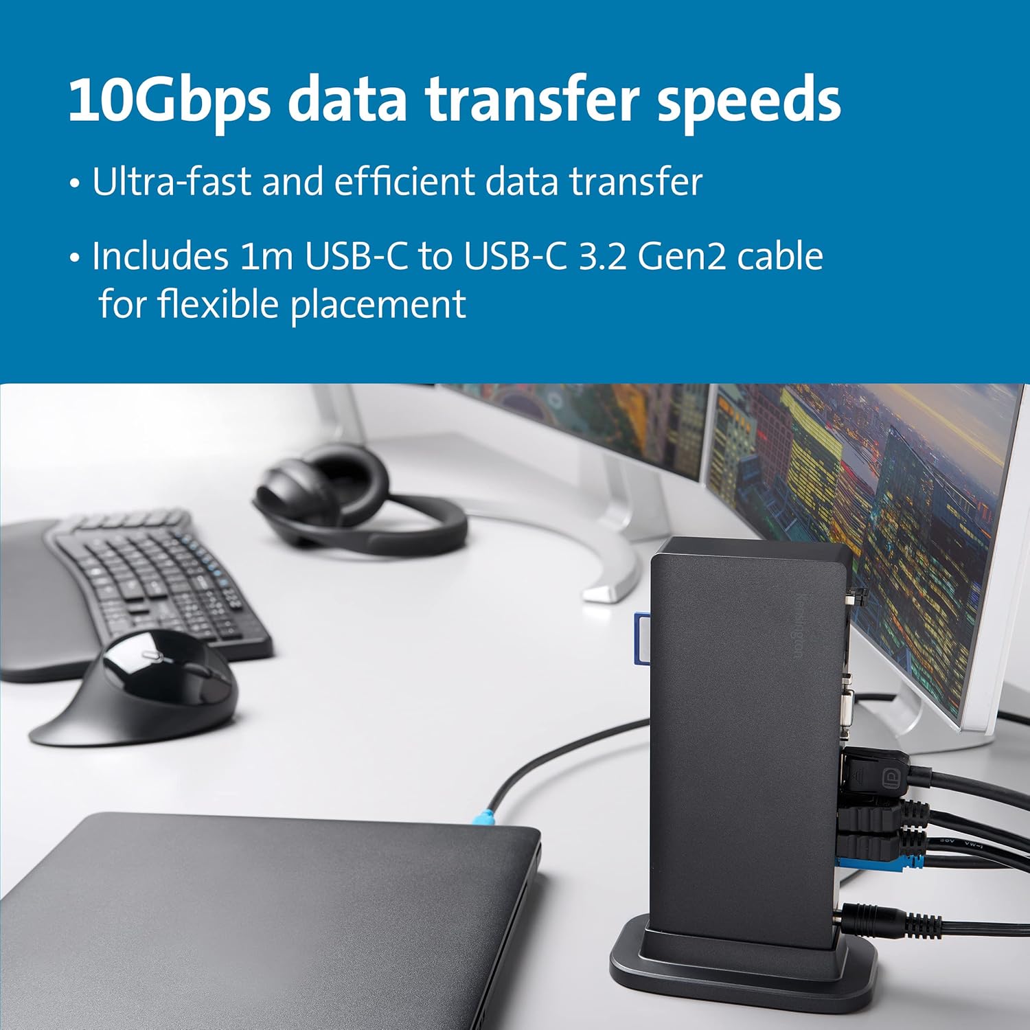 1M USB-C 3.2 Gen-2 cable (included) connects the dock to your device; 135W power provides 100W laptop charging to laptops that accept Power Delivery, plus power for peripherals