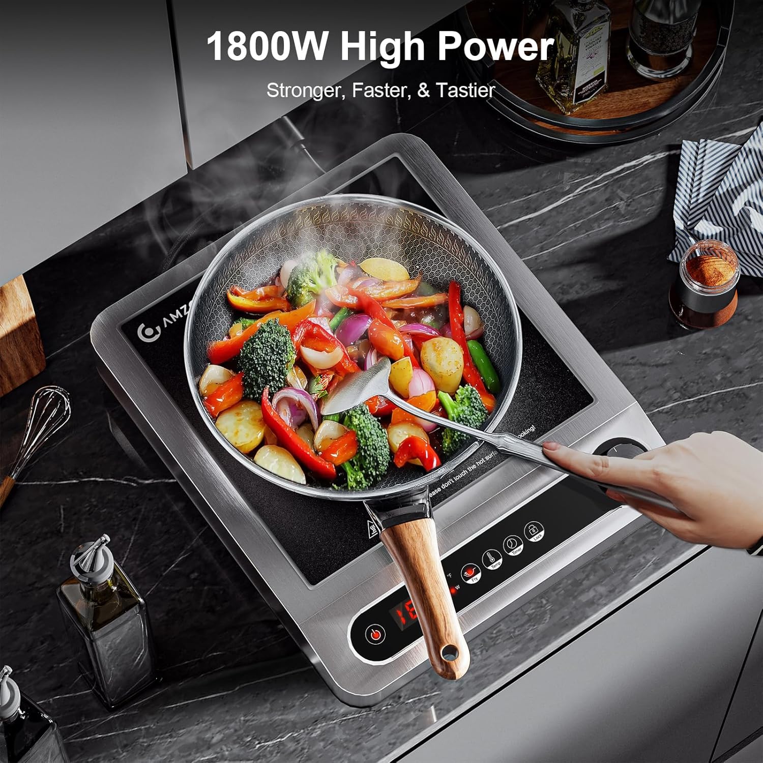【18-Level Power & Temperature Control】 AMZCHEF professional induction cooktop take full command of your cooking with 18 power(max 1800W) and temp. control(140°F ~ 465°F). Countertop burner precise flexibility allow cooker to perfectly simmer delicate sauces, rapidly boil water, or maintain a low heat for melting chocolate. Induction burner ensure professional results every time.