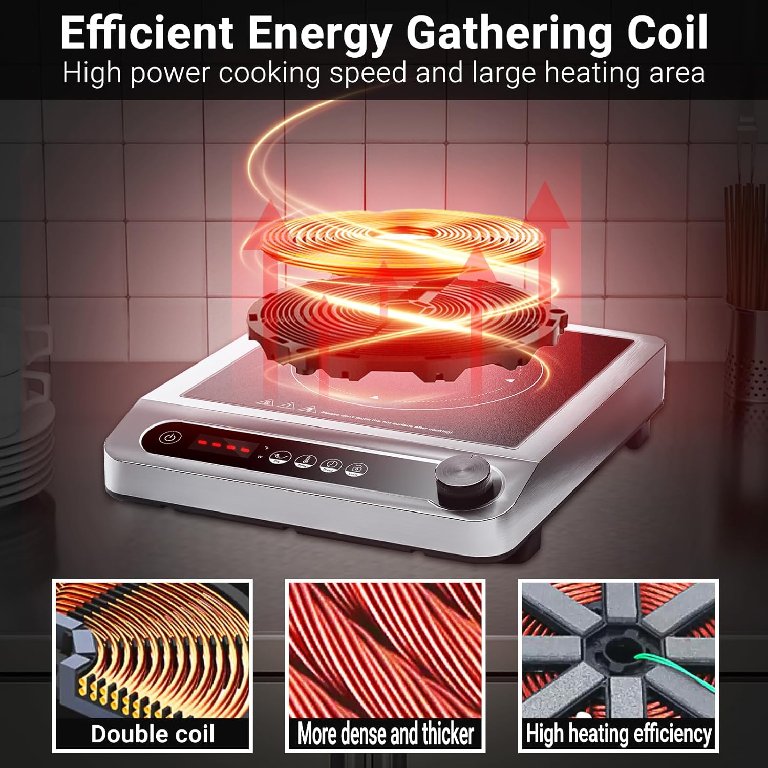 【Intuitive Control Panel】 The AMZCHEF portable Induction burner features a clearly labeled interface with a single rotary knob for instant and precise power adjustment, plus a 3H timer for hands-free cooking. This user-friendly design ensures even beginners can operate hot plate with confidence. Commercial induction cooktops help restaurant, chain eateries&hotels boost operational efficiency.
