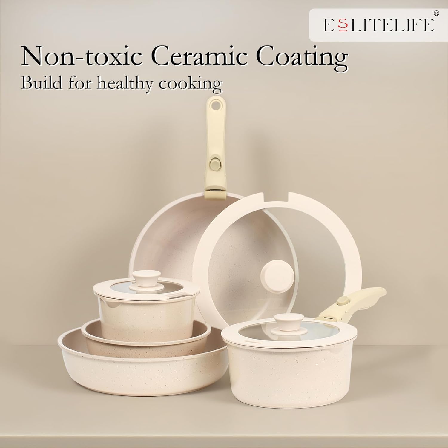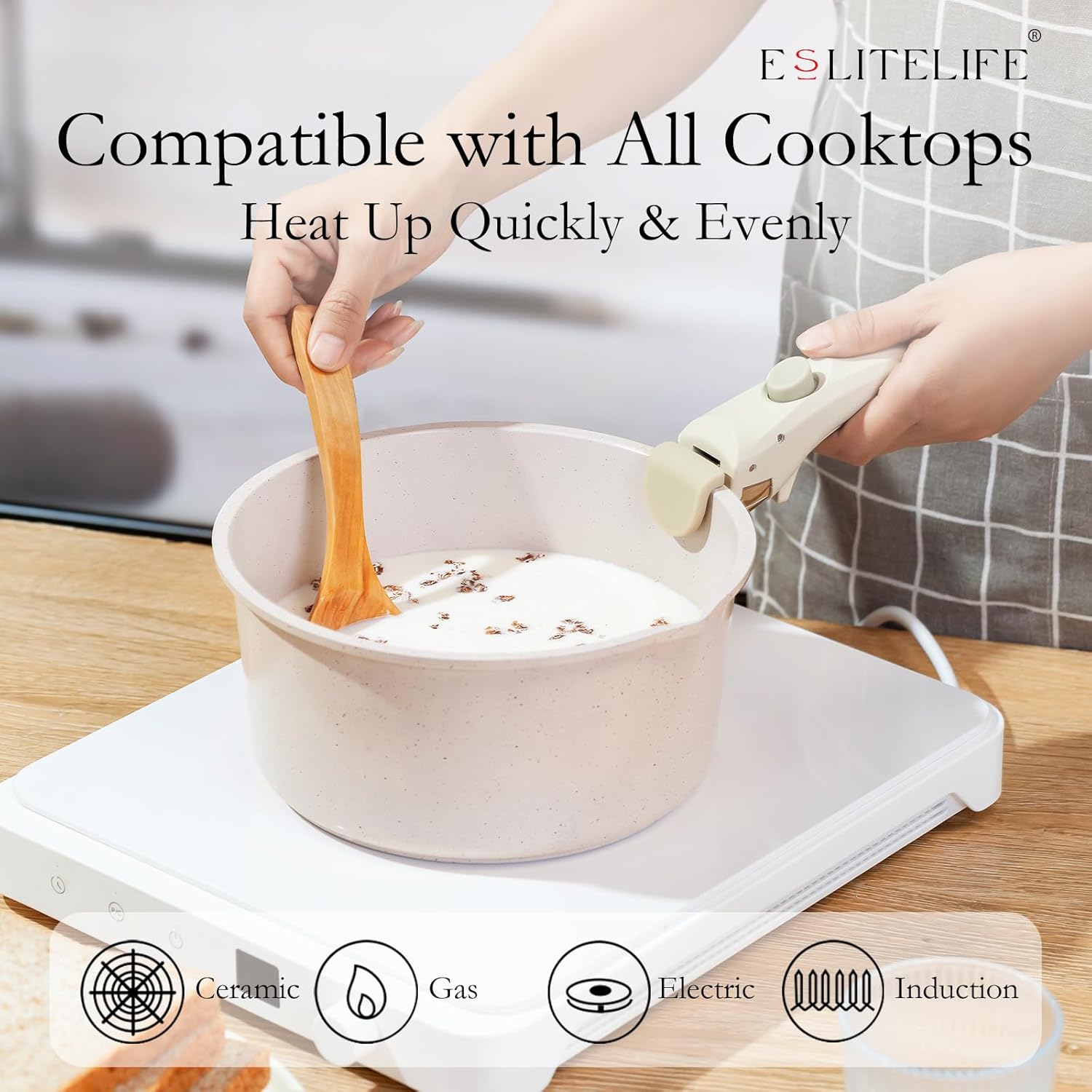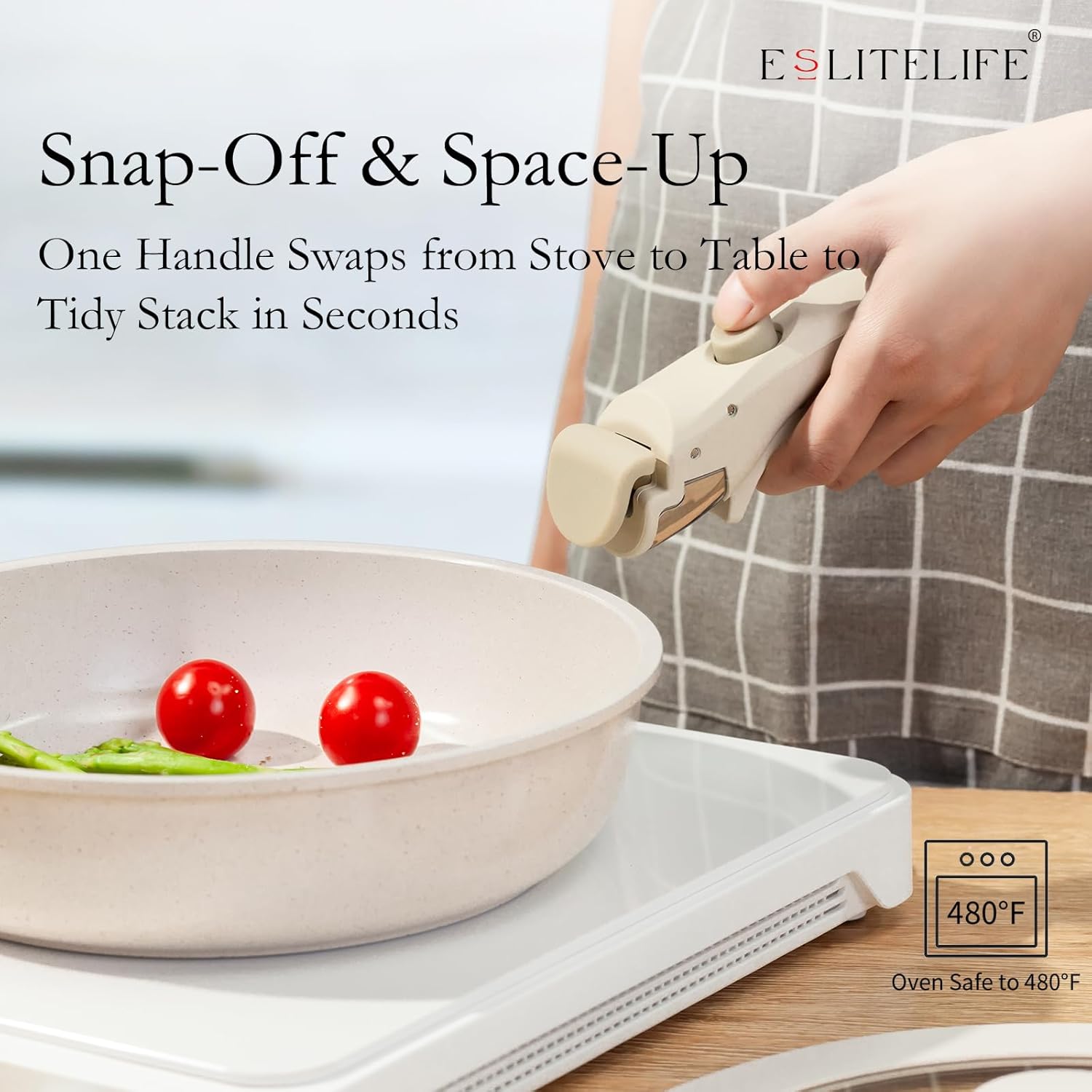 Healthier Way of Cooking – ESLITE LIFE 10 Pcs Pans and Pots Set Includes: (1)1.5 QT saucepan with lid, (2)2.5 QT saucepan with lid, (3)8 inch frying pan, (4)11 inch frying pan, (5)11 inch saute pan with lid, here we provide a healthier way of daily cooking. The detachable handle not only makes cleaning and storage more convenient but also maximizes kitchen space. Time to upgrade your pots and pans and spruce up your kitchen decor!