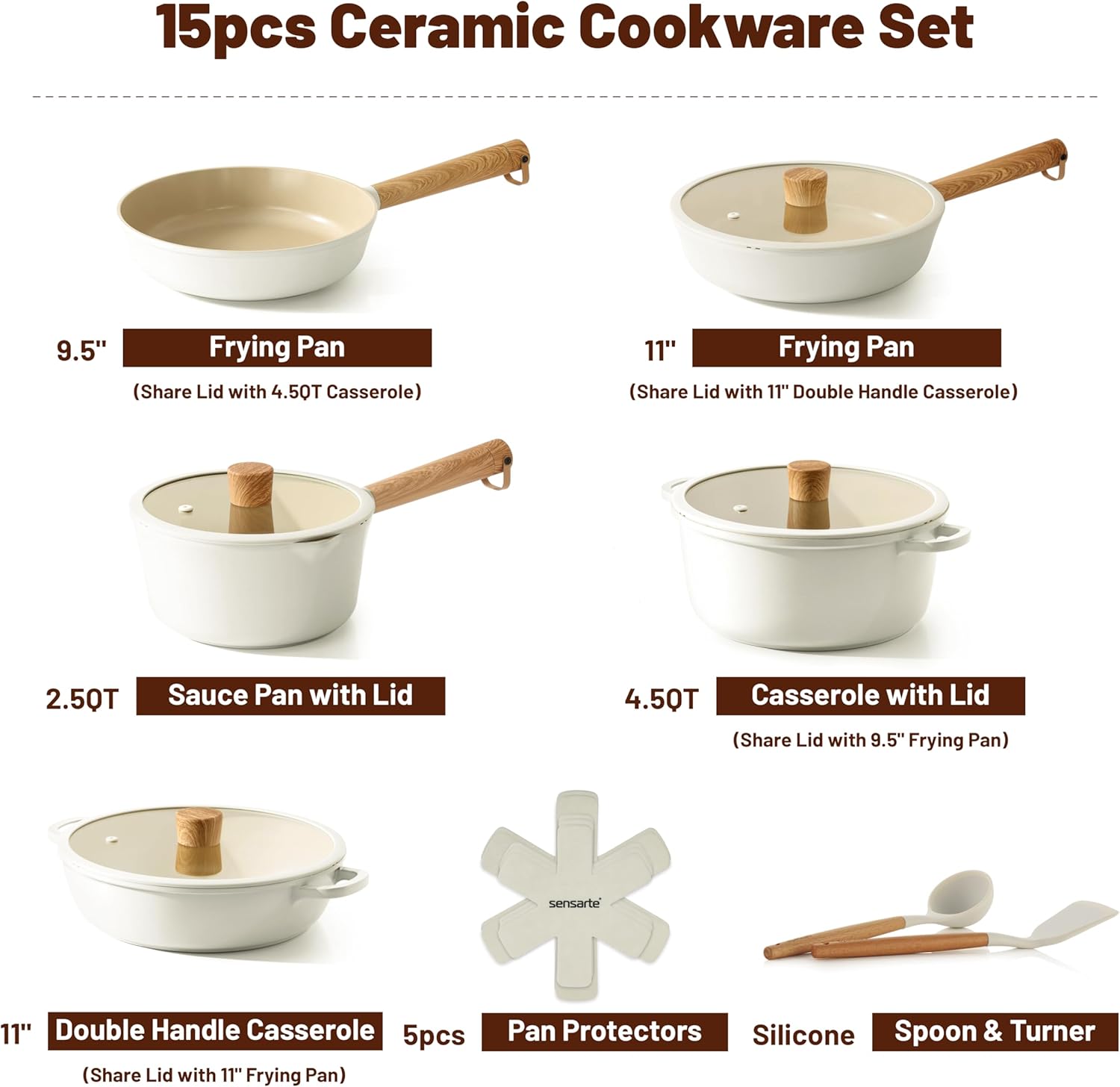15pcs Nonstick Kitchen Cookware Set: 8 inch frying pan, 11 inch deep frying pan, 2.5 Quarts saucepan with lid, double handle 11 inch sauté pan with lid, 4.5 Quarts casserole pot/dutch oven with lid, 2 silicone utensils, 5 pot protectors, 4 anti-scald silicone protectors.