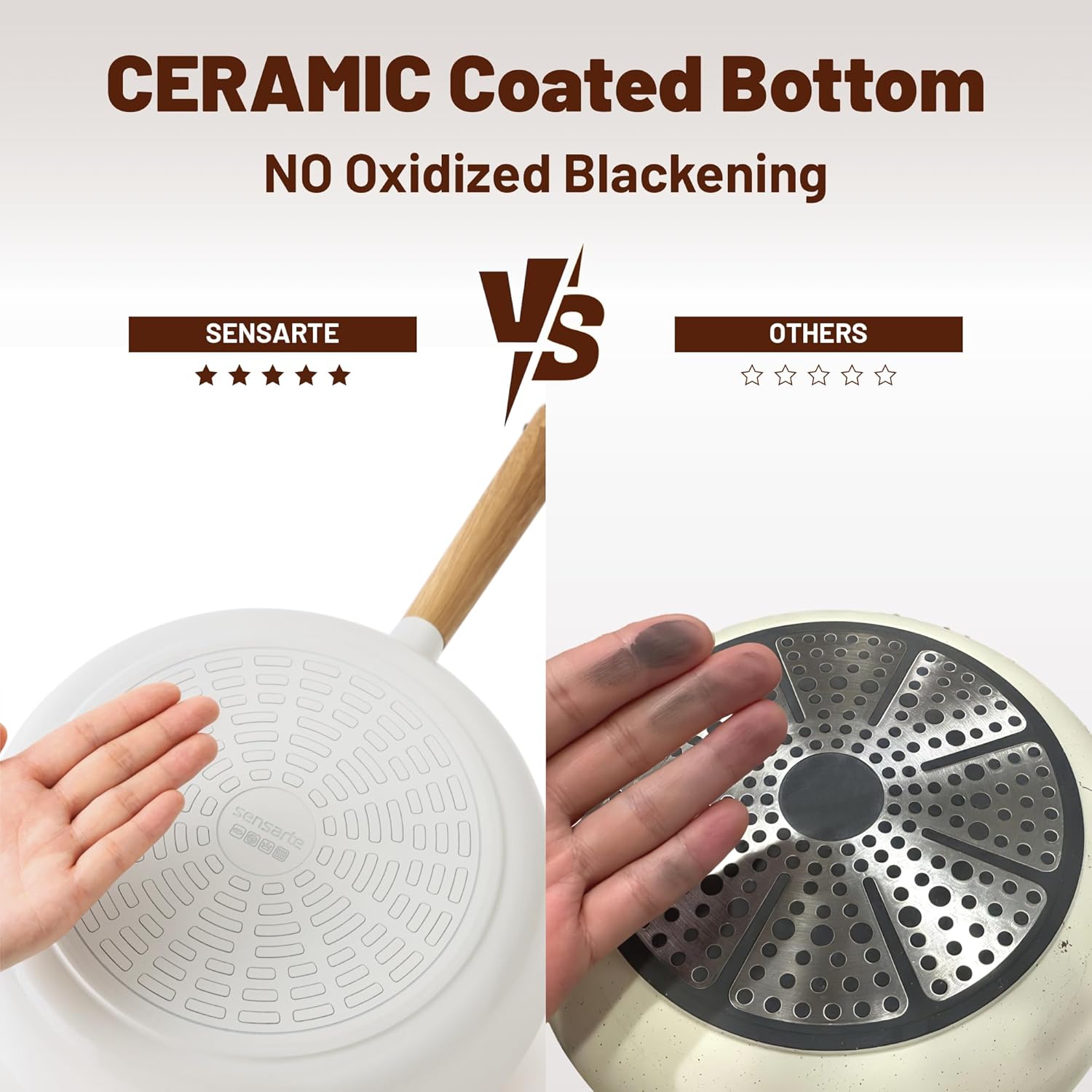 Exclusive Design Compound Bottom: Innovative SUNSHINE bottom for better heat gathering, stronger magnetic conductivity, fast and even heating. Fully coated bottom solves the problem of oxidized blackening and protects the glass countertop from scratches. Dishwaser Safe. All cooktops compatable include indcution.