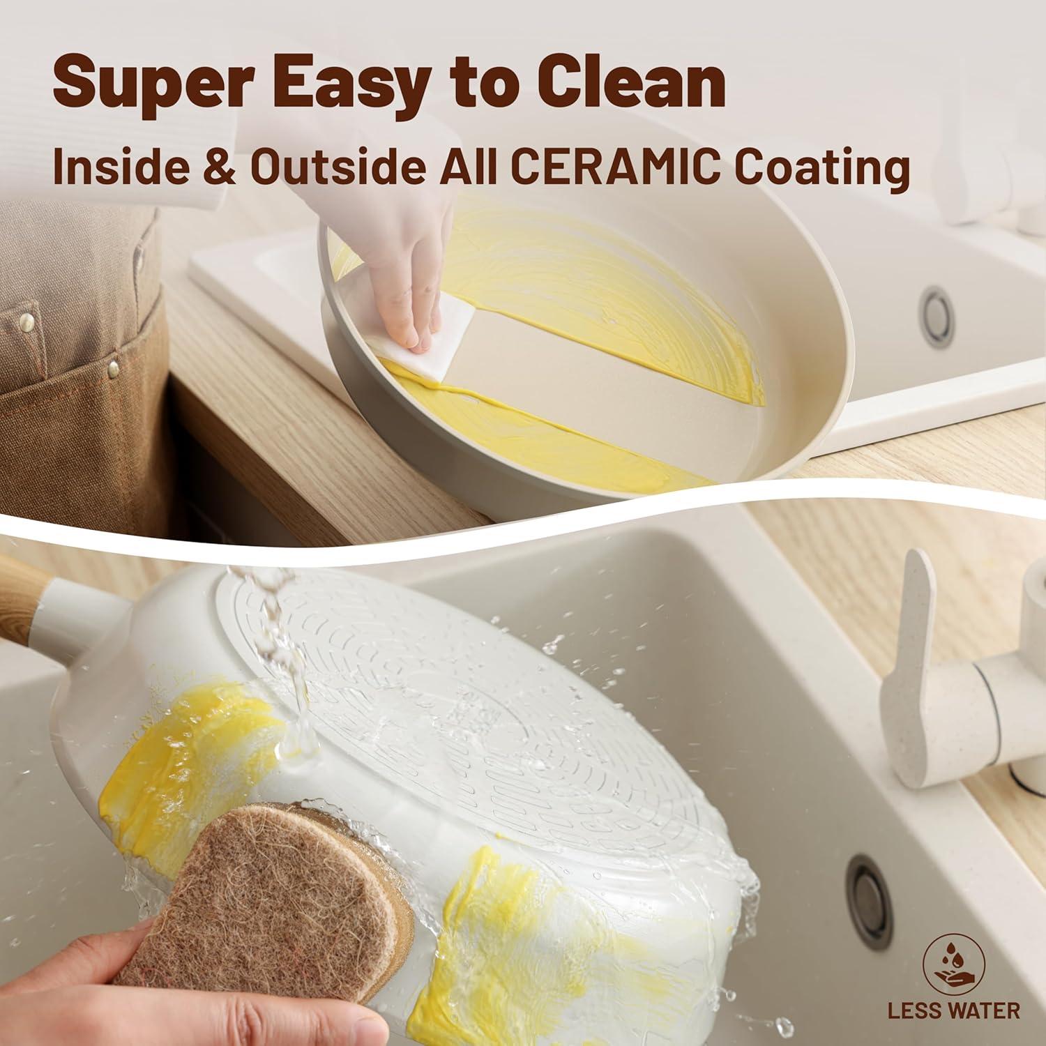 All Ceramic Coating: Internal ceramic coating for safe,healthy and non-toxic cooking with less oil. Free of intentionally added PFAS/PTFE/PFOA/lead/cadmium. This non toxic cookware set will not produce toxic fumes even overheated. External ceramic coating ensures ease of cleaning and greater stain resistance.