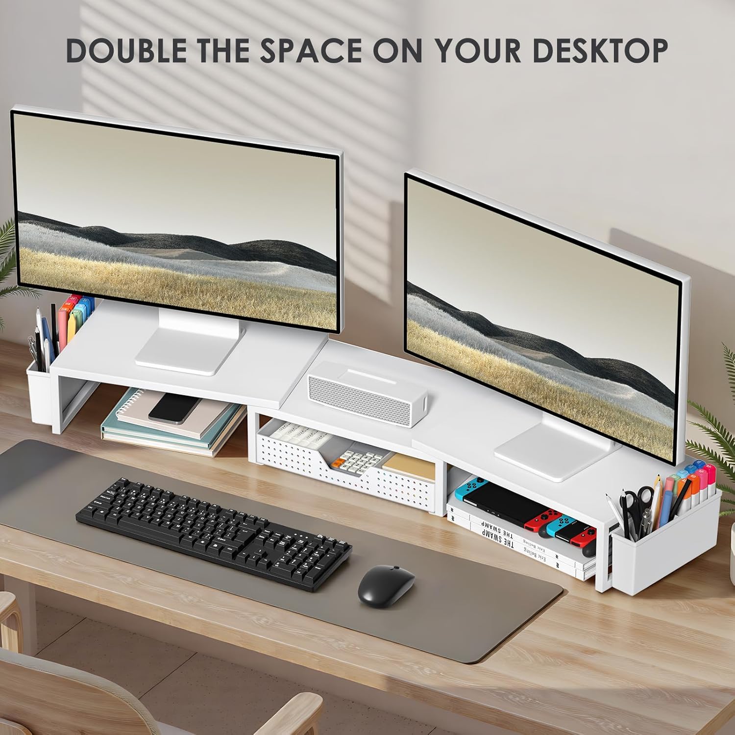 【 Dual Monitor Stand with Smart Storage】Clear workspace clutter effortlessly. Organize desk accessories & office supplies in handy 2 hanging pen holders and a drawer. Keep essentials visible and instantly accessible for better focus and efficiency
