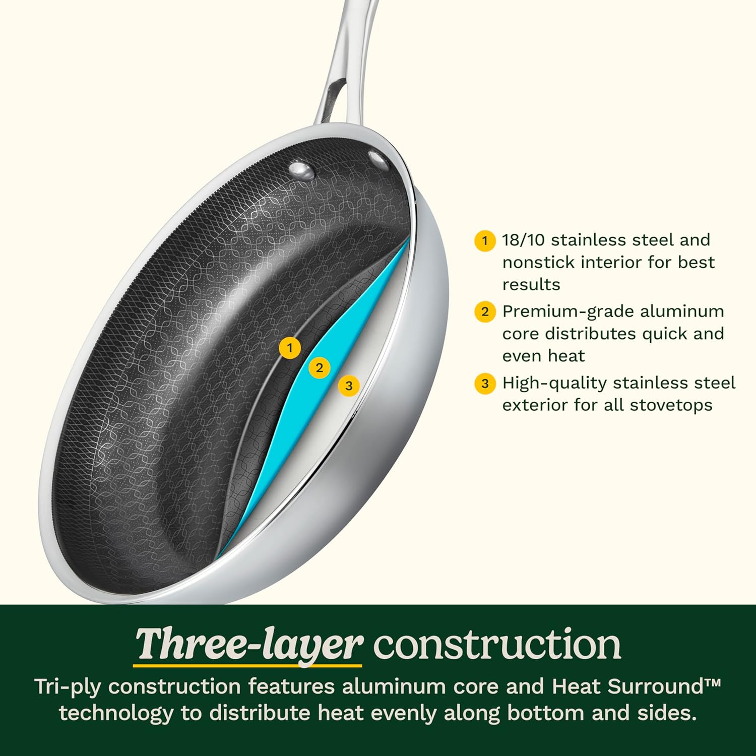 THREE-LAYER CONSTRUCTION: Stainless steel frying pan features Tri-ply construction with aluminum core and Heat Surround technology to distribute heat evenly along the bottom and sides of the skillet cookware.