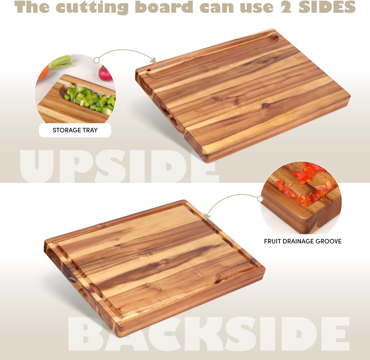 ✅ FRIENDLY SURFACE, NATURAL WOOD : Our cutting boards are made from 100% natural acacia wood, natural color (no paint) so you do not need to worry about chemicals leaching out and absorbing into the food. Wood is a natural product, containing natural deviations in its appearance. Each and every cutting board is beautifully unique with natural color and pattern.