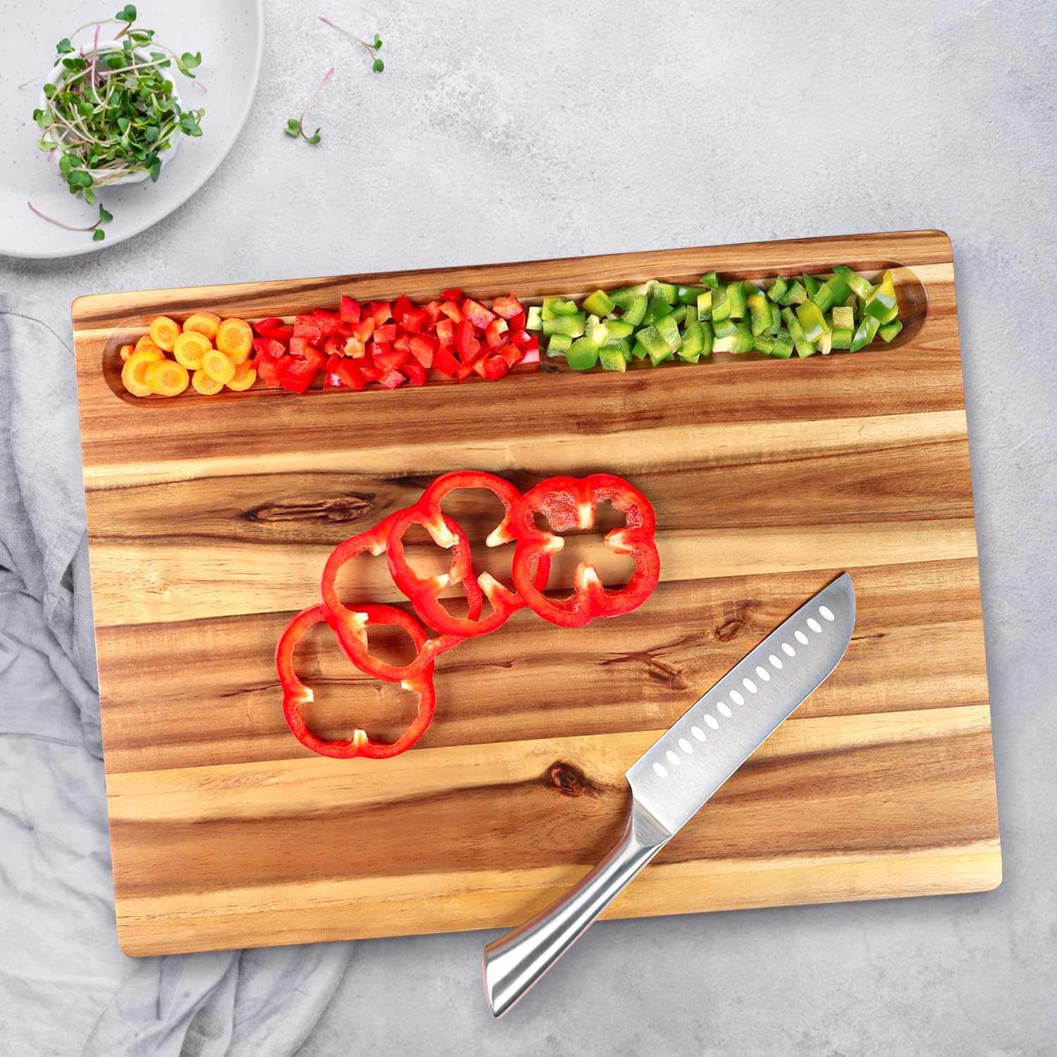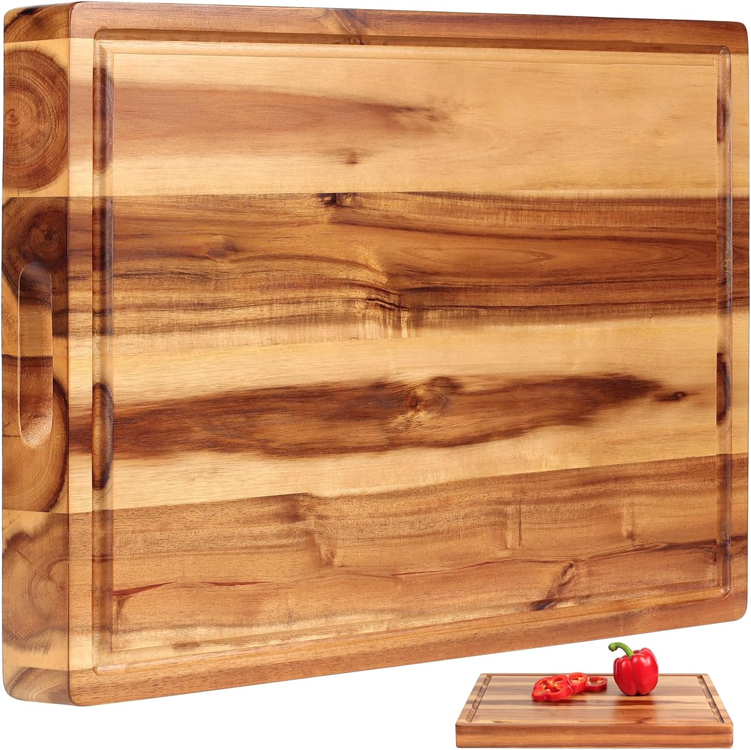 ✅ SOPHISTICATED DESIGN, MULTIPURPOSE: Front side with new design expertly carved juice groove around one edge to catch runaway liquids. Backside with long holder for cutting breads and cheeses. You can also use it as a serving board to serve everything from bread to meats to cheeses to pizzas. The inner side handles also make it easy to grab and move the board while keeping a clean kitchen. Dark grained wood gives a mix of rustic charm and elegance to your kitchen.