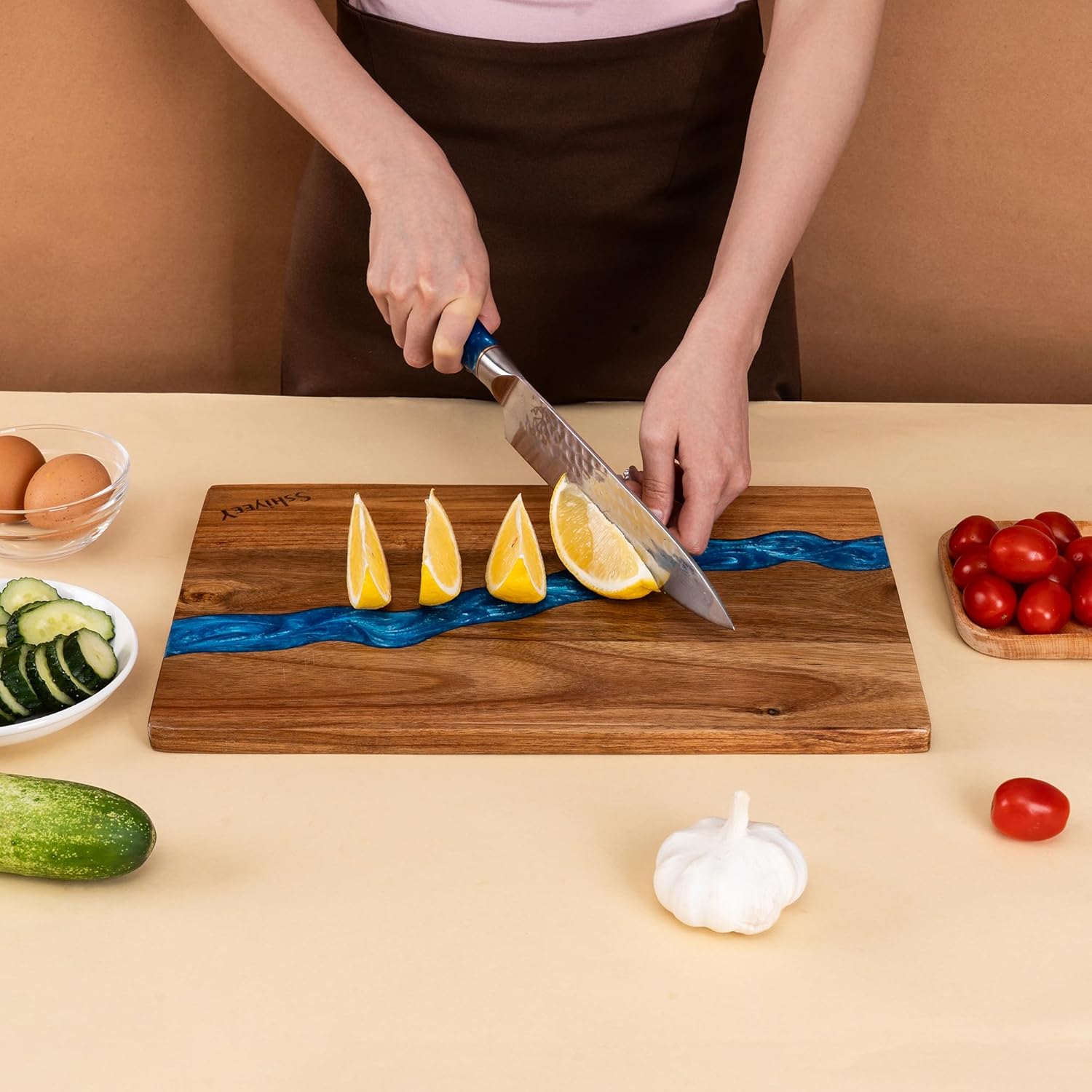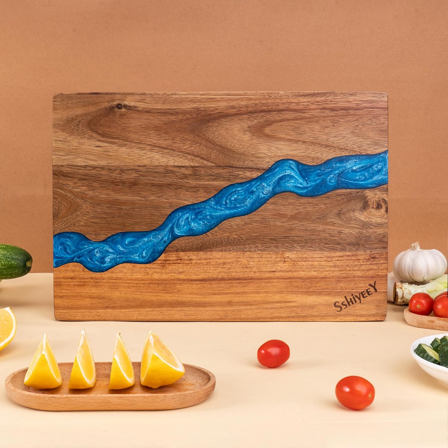 Nature-Inspired Artistry Crafted with a mesmerizing blue epoxy river flowing through rich acacia wood, this unique cutting board captures the organic beauty of natural waterways. The seamless fusion of wood and resin creates a decorative cutting board for kitchen that doubles as a functional art piece, infusing your space with serene elegance