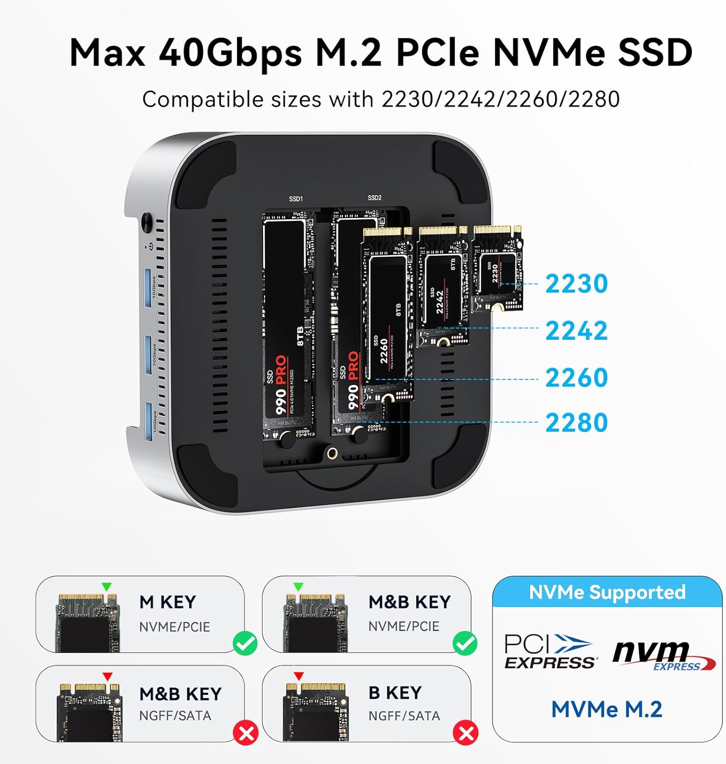 【Up to 16TB Expandable Storage】 Supports 2×NVMe SSDs, delivering up to 16TB at 40Gbps in RAID 0 mode or 8TB at 20Gbps in other modes. Designed to expand Mac Mini storage and eliminate capacity concerns. The included 30W PD adapter provides stable self-power, minimizing the risk of disconnection, display issues, or drive failure. ⚠️ Do not plug or unplug SSDs while powered on.