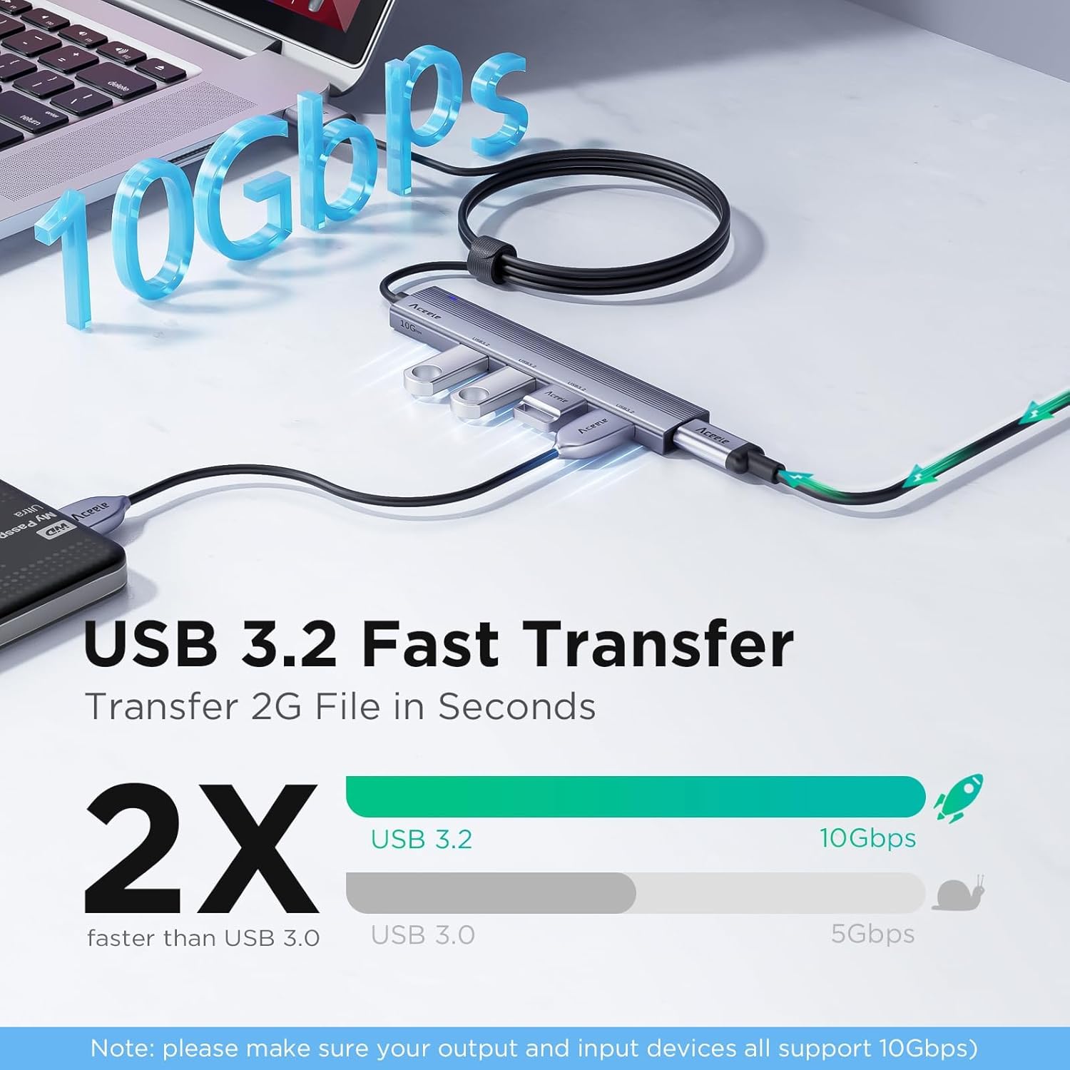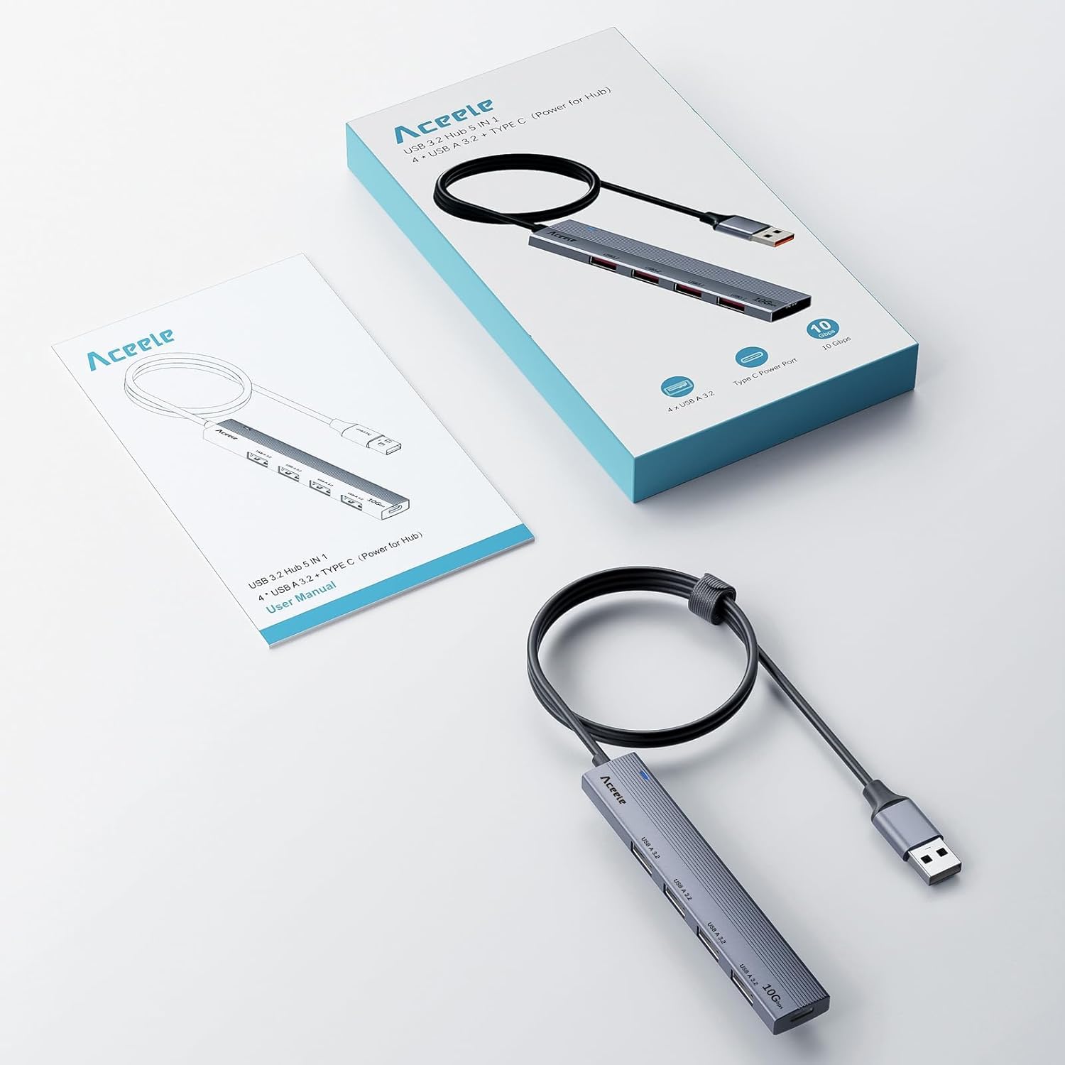 Aceele 10Gbps USB 3.2 Hub with 4 USB A 3.2 + 5V 3A USB C Powered Support Port, 120cm/4Ft Long Cable