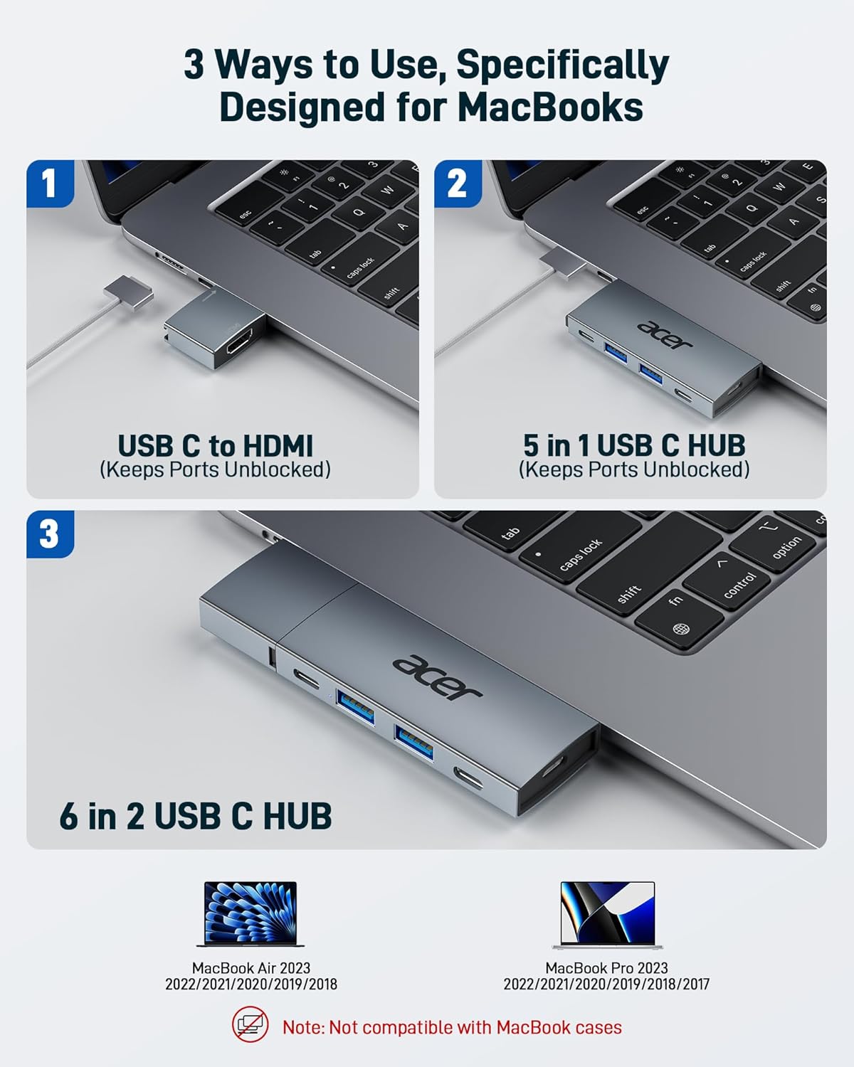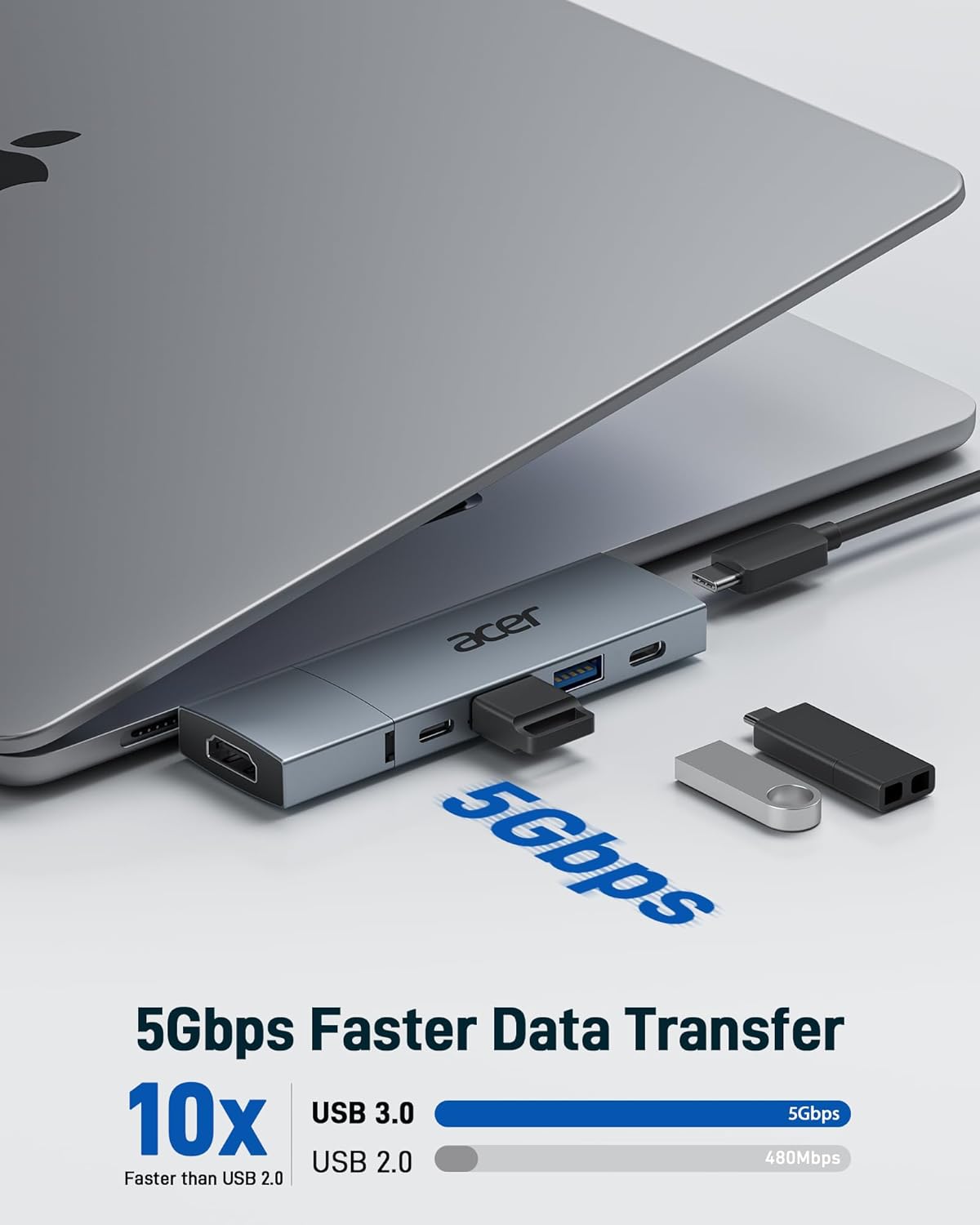 Removable Macbook USBC Hub: Acer USB-C hub for MacBook Air/Pro M1/M2/M3/M4 features a detachable 6-in-2 design, combining a USB-C to HDMI adapter and a 5-in-1 USB-C hub. Compact and lightweight, it fits easily in your laptop bag for on-the-go use. Expand connectivity without blocking MacBook ports. (📌Note: Not compatible with laptops with thick protective cases.)