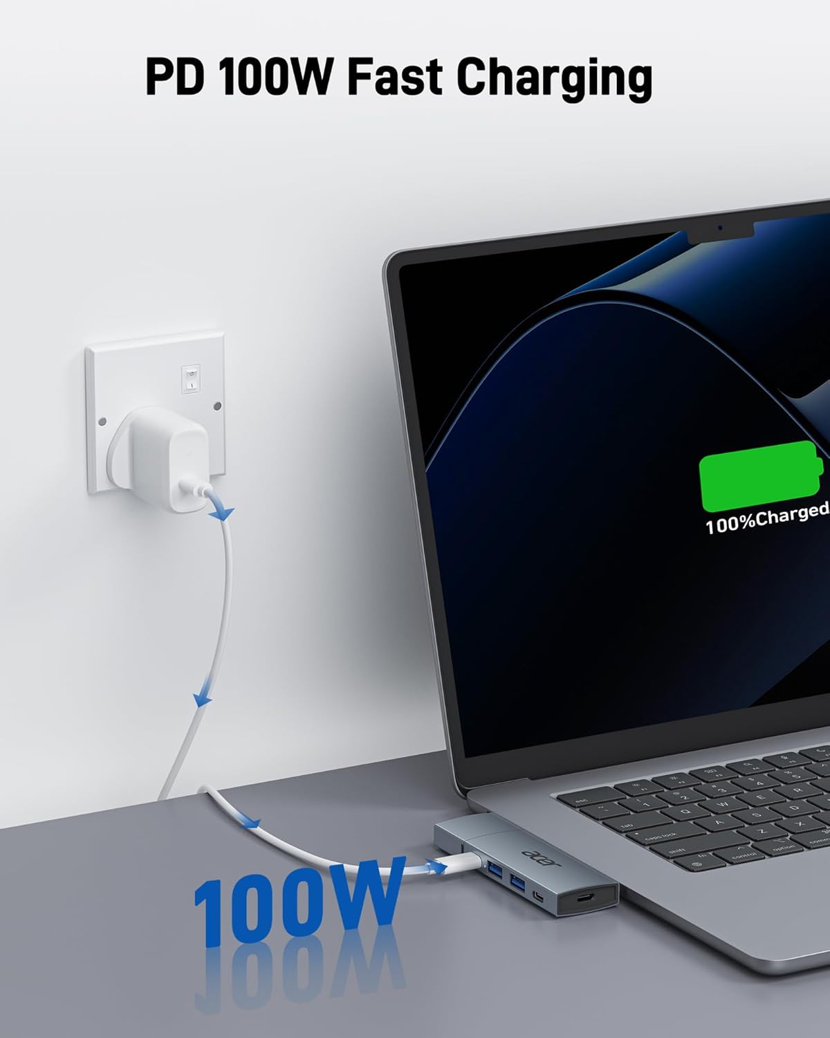 100W PD Fast Charging: This USB C dongle supports up to 100W PD fast charging, keeping your MacBook or USB-C devices powered without delay. Works seamlessly with this macbook docking station. (📌Note: Not support data transfer. Please use with a PD100W charger. Not suitable for powering external monitors. Recommended cable: USB-C to USB-C cable supporting PD 3.0, 100W/5A.)