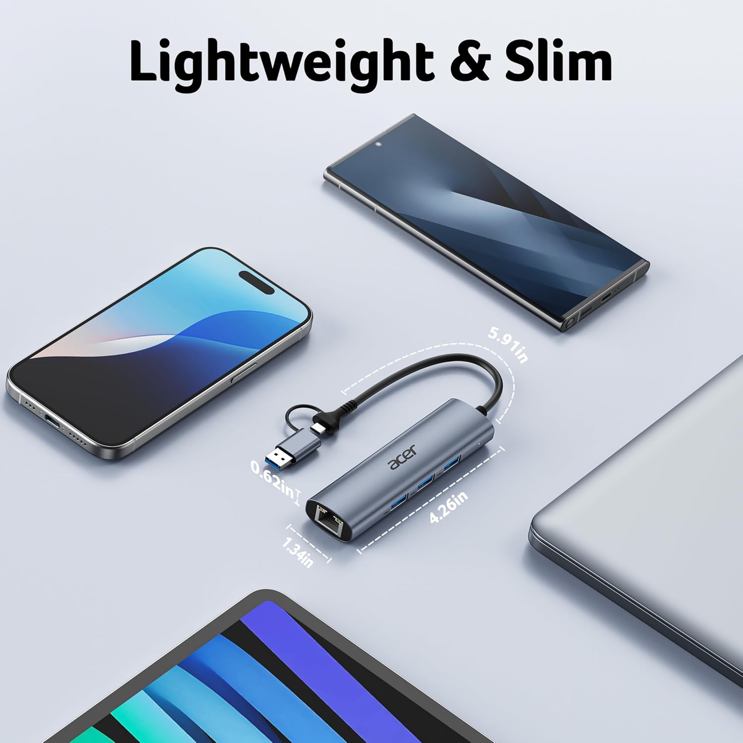 Acer USB to Ethernet Adapter, USBC Hub Ethernet 1Gbps with 3*USB 3.0, Aluminum Heat Dissipation, Driver Free, USB to Network Adapter for Windows 10, 8.1, Mac OS, Laptop, MacBook Pro, iPad, XPS, etc