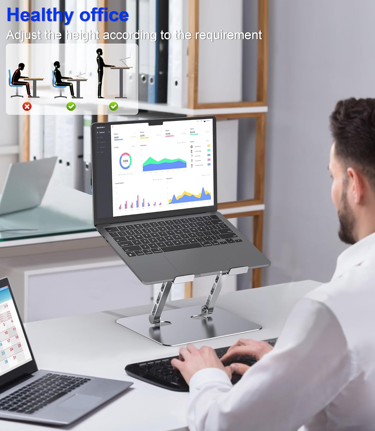Adjustable Height: This foldable laptop stand adjusts the height and angle of your laptop, flexibly raising the height of your laptop from 2 inches to 21 inches to better match sitting and height.It is ergonomically designed to minimize neck fatigue and say goodbye to neck pain