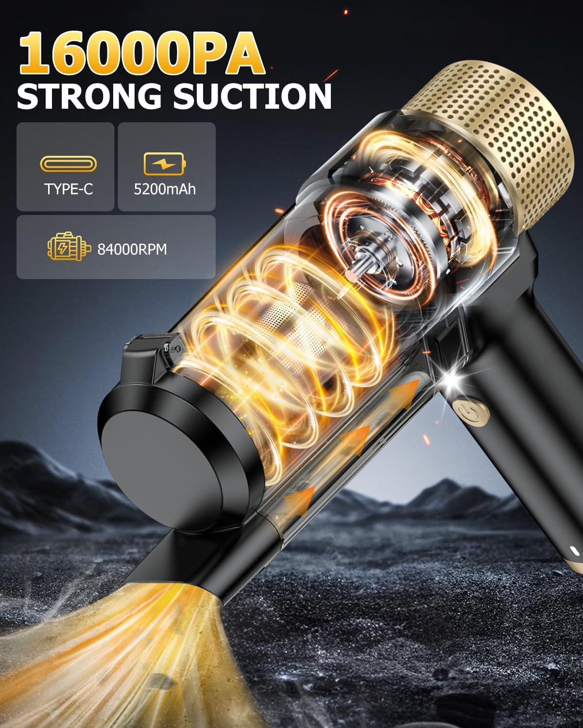 🌀【16000PA Suction Power】This car vacuum portable cordless features a strong suction power of 16,000 PA and a motor speed of 84,000 rpm, making it quick and easy to remove hard-to-tackle pet hair, fine debris, and other common dirt. Designed to meet your diverse cleaning needs, it efficiently handles various challenges whether at home, in the office, or in the car, taking the hassle out of tidying up