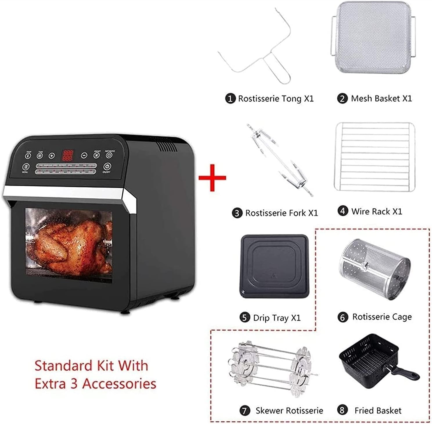 The 12 Litre Air Fryer Oven . It was designed with a high-quality stainless steel interior and comes with 8 accessories (3 as optional) to maximize your cooking potential. Air Fry, roast, rotisserie, bake, dehydrate,etc! Youu2019ll easily cook the taste of delicious, healthy food without a drop of oil in the kitchen. Heating temperature can be controlled and adjusted which allowing you to select and control the optimal temperature for different kinds of food. Indulge yourself to cooking and make delicious food for your families.