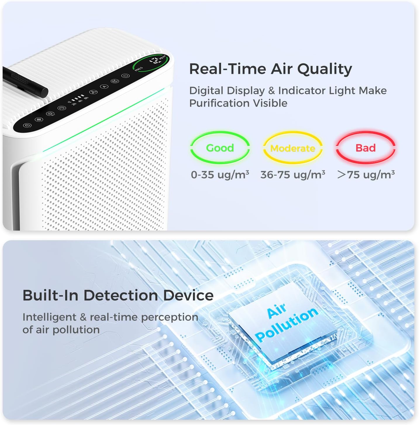 Make Purification Visible: Use the built-in air detection device, PM2.5 readings and light changes to see how well it’s working. It helps you “see” and “choose”, turning passivity into action. In AUTO mode, it automatically adjusts fan settings based on air quality, making your life even more convenient.