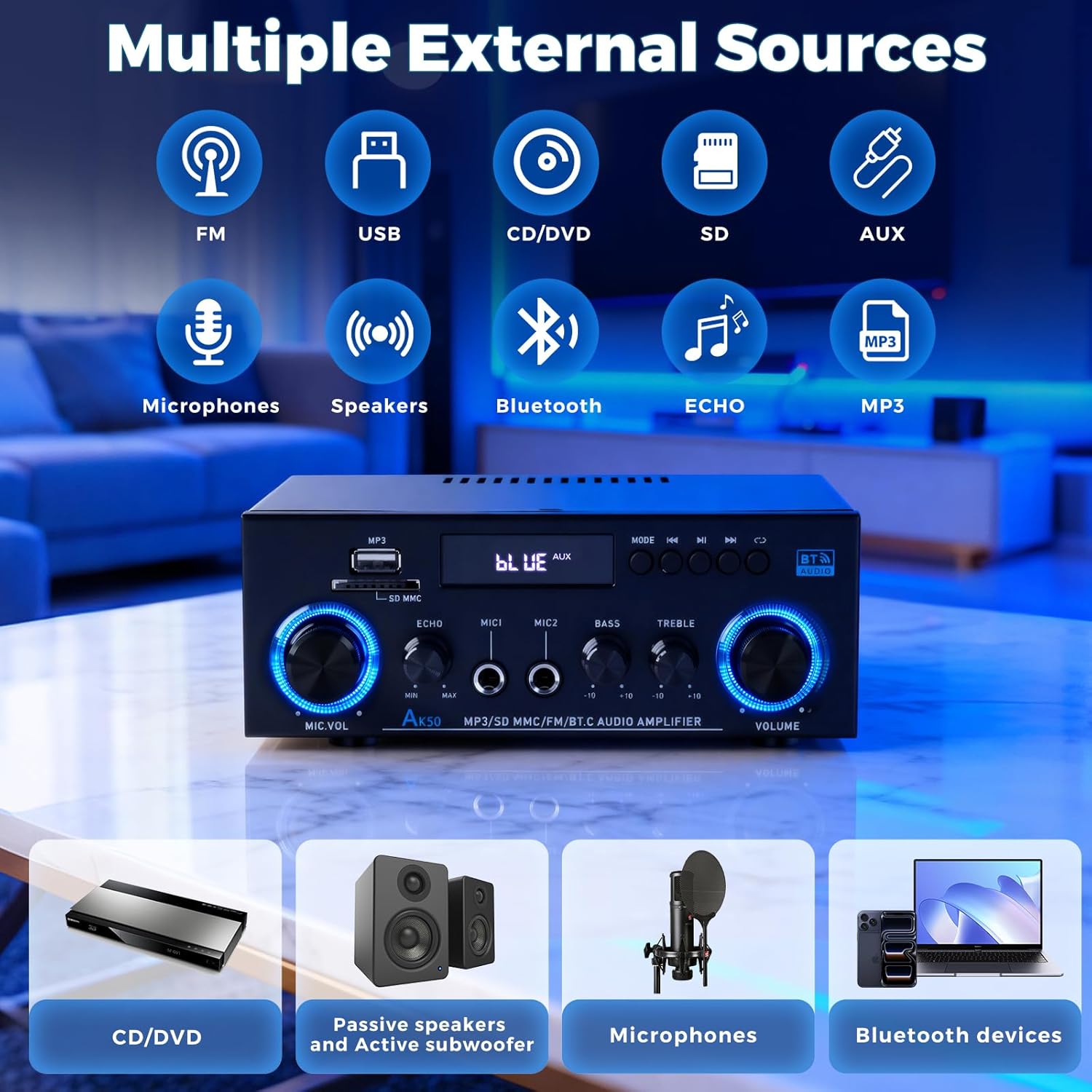 AK50 Stereo Audio Amplifier, 400W Home 2 Channel Wireless Bluetooth 5.0 Power Amplifier System, Home Amplifiers FM Radio, USB,Mic, SD Card, with Remote Control Home Theater Audio Stereo System