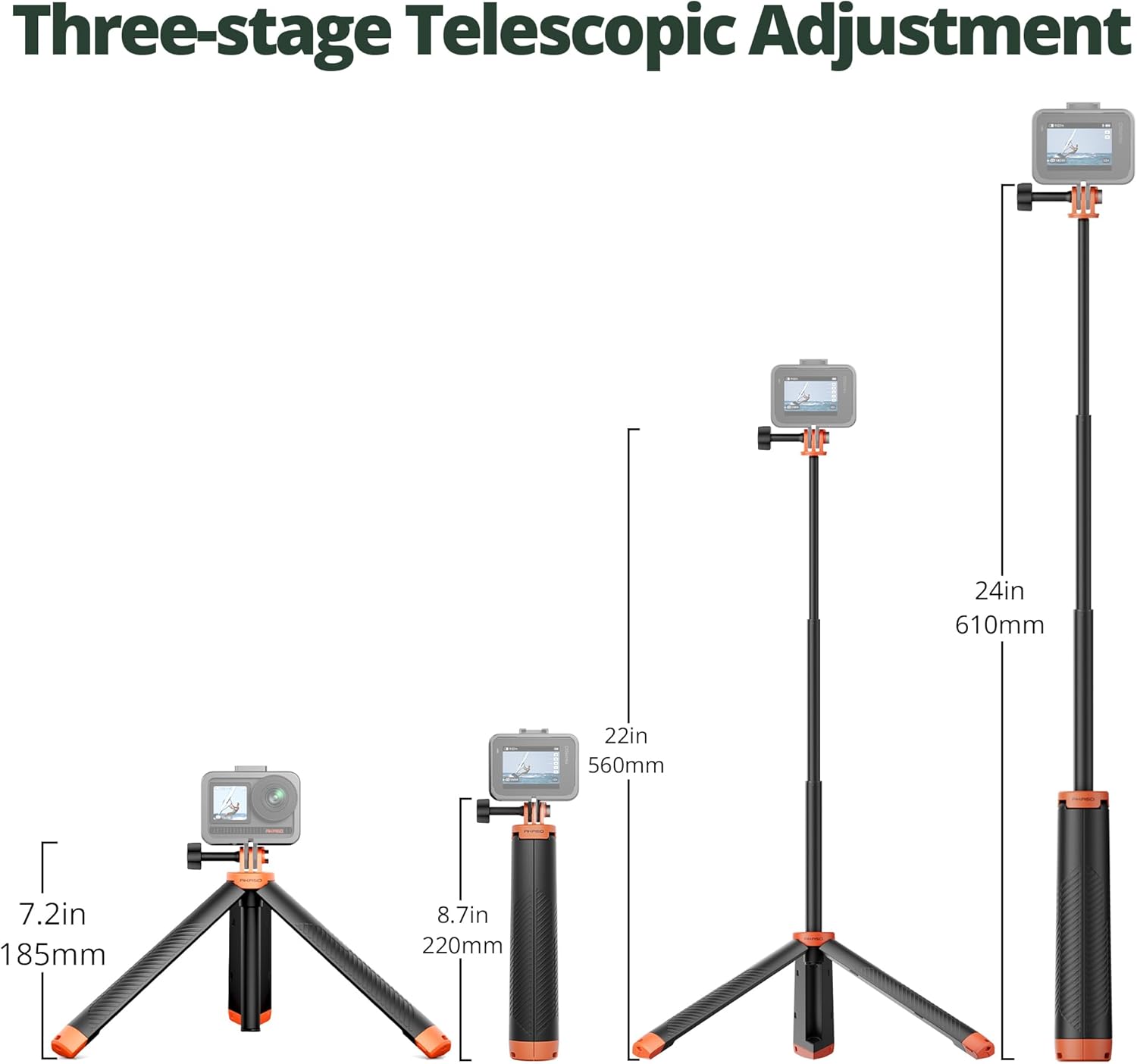 Easy to Assemble and Extend: The extension selfie stick can extend in 3 separate lengths, allowing quick length adjustments from 8.6″to 24″.