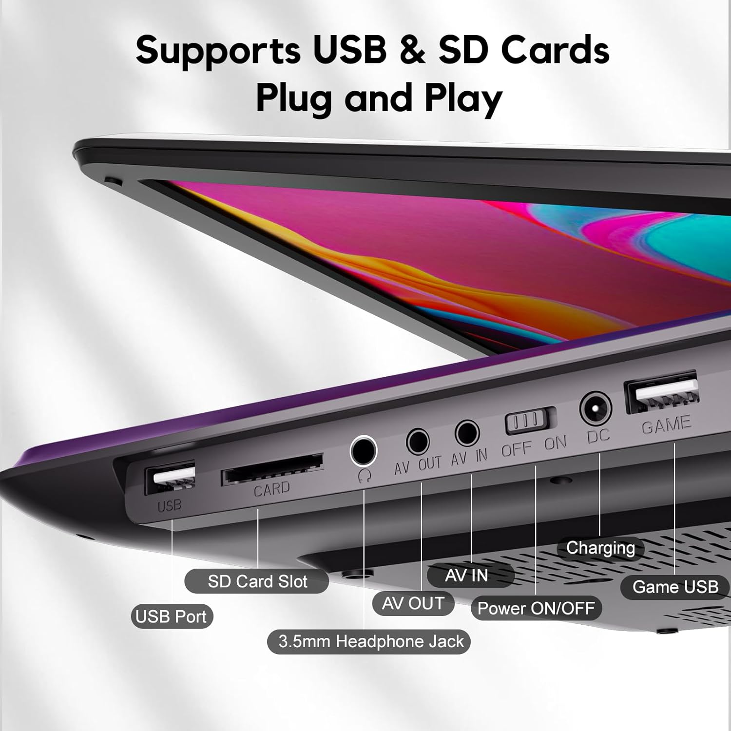 AKIYO 17.5″ Portable DVD Player with 15.6″ Large HD Screen for Car and Kids, 6 Hours Rechargeable Battery, Dual Stereo Speakers, Support USB/SD/AV/Audio/Sync TV and Multiple Disc Formats, Purple