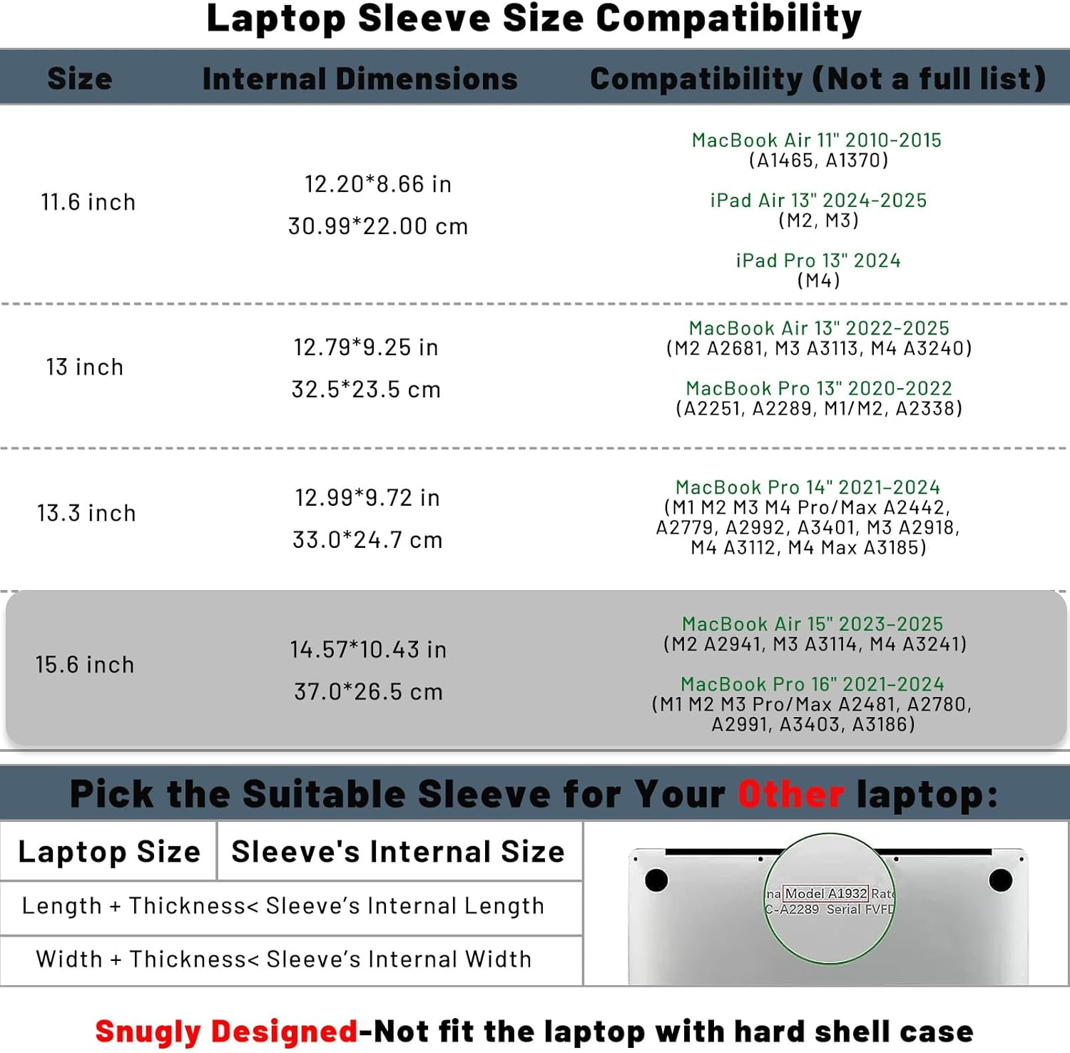 Compatible Models: MacBook Pro 16″ 2021-2024 (M1 M2 M3 Pro/Max A2481 A2780 A2991 A3403 A3186); MacBook Pro 16″ 2019 (A2141); MacBook Pro 15″ Retina 2010-2019 (A1990 A1707 A1398); MacBook Air 15″ 2023-2025 (M2 A2941 M3 A3114 M4 A3241). Also compatible with other brands of laptops. If the computer comes with a hard case, you will need to add the case dimensions to the measurement