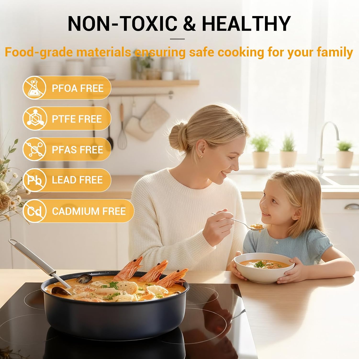 Non-Toxic & Family-Safe: Free from PFAS, PFOA, and PTFE; Food-grade ceramic coating non-toxic pots and pans set provides safe, worry-free cooking with no harmful fumes; A healthier choice for daily family meals