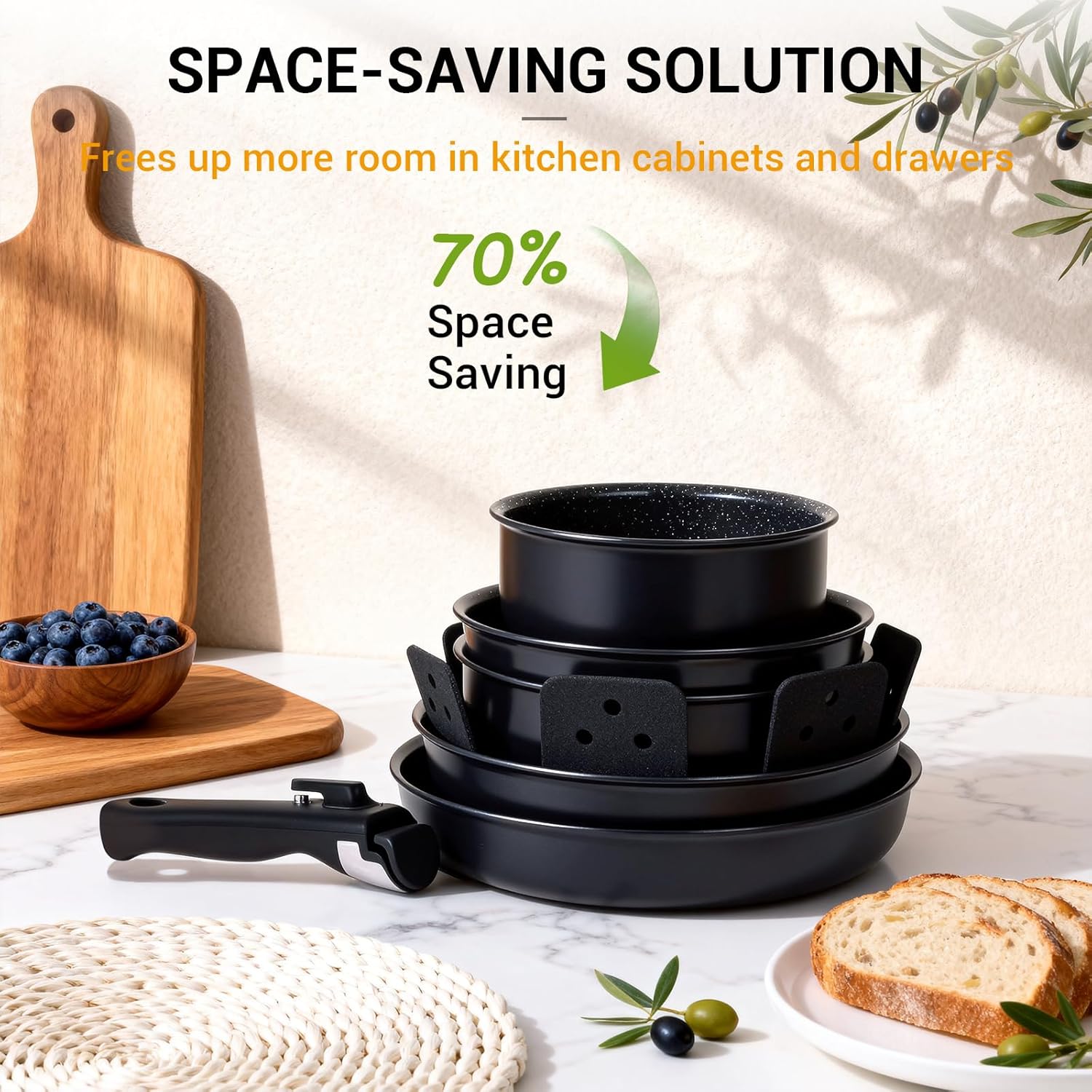 The removable handles make it easy to stack and store your cookware set compactly, saving up to 70% of your cabinet space.