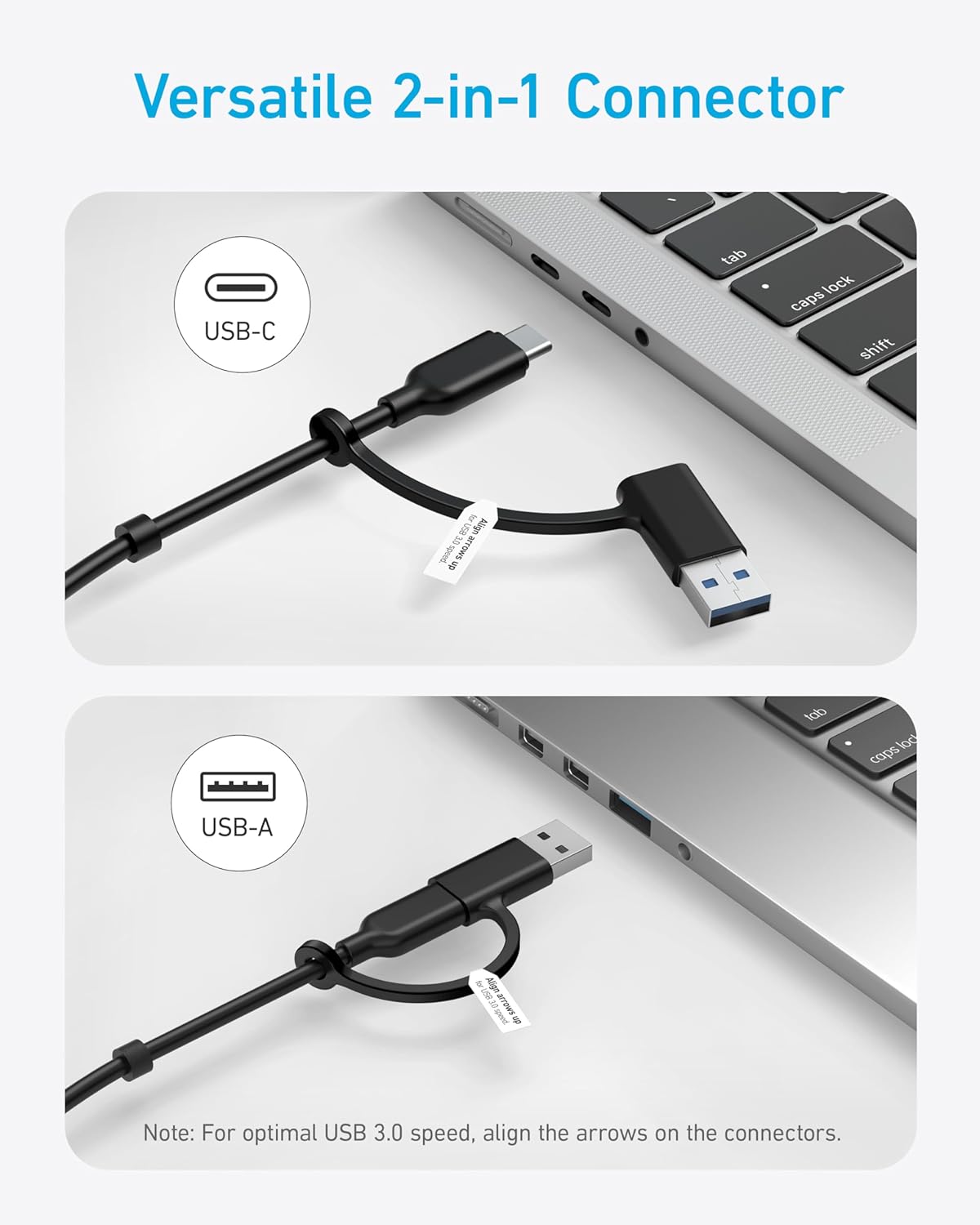 2-in-1 Connector: Equipped with a versatile 2-in-1 connector that effortlessly adapts to both USB-C and USB-A devices for maximum compatibility.