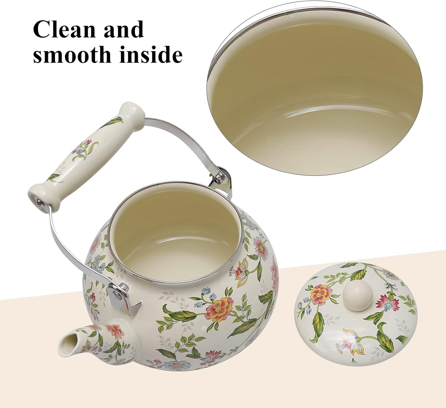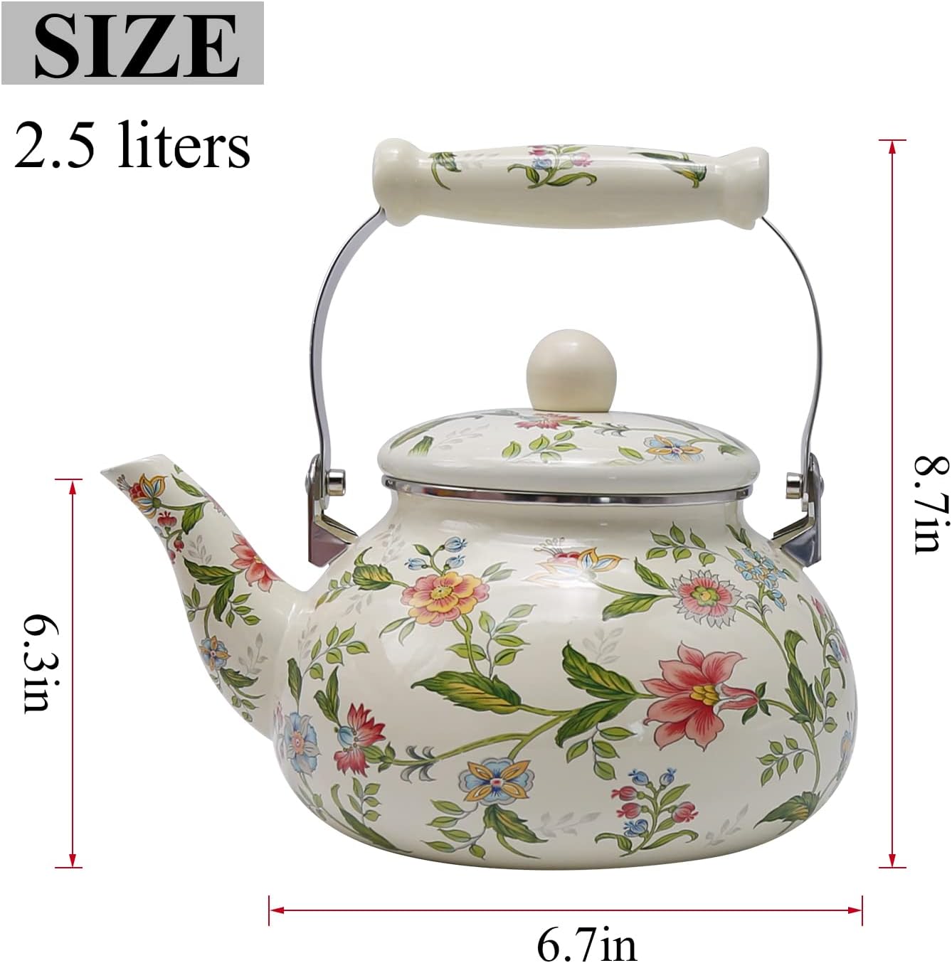 Made from lead-free enamel, it’s safe and rust-resistant. The heat-resistant ceramic handle ensures easy handling, while its compatibility with various stovetops (except gas) offers versatility Its generous capacity of 80oz (2.5L) is suitbale for brewing multiple cups of tea, making it ideal for gatherings or daily use This kettle is not just a kitchen essential; it’s an exquisite gift for tea lovers, suitable for weddings, housewarmings, and special occasions