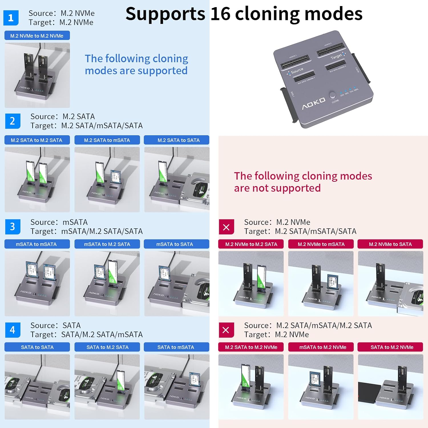 Support SATA 2.5”/3.5 to 2.5”/3.5 SATA CloneSupport SATA 2.5”/3.5 Clone to M.2 SATASupport SATA 2.5”/3.5 Clone to mSATA