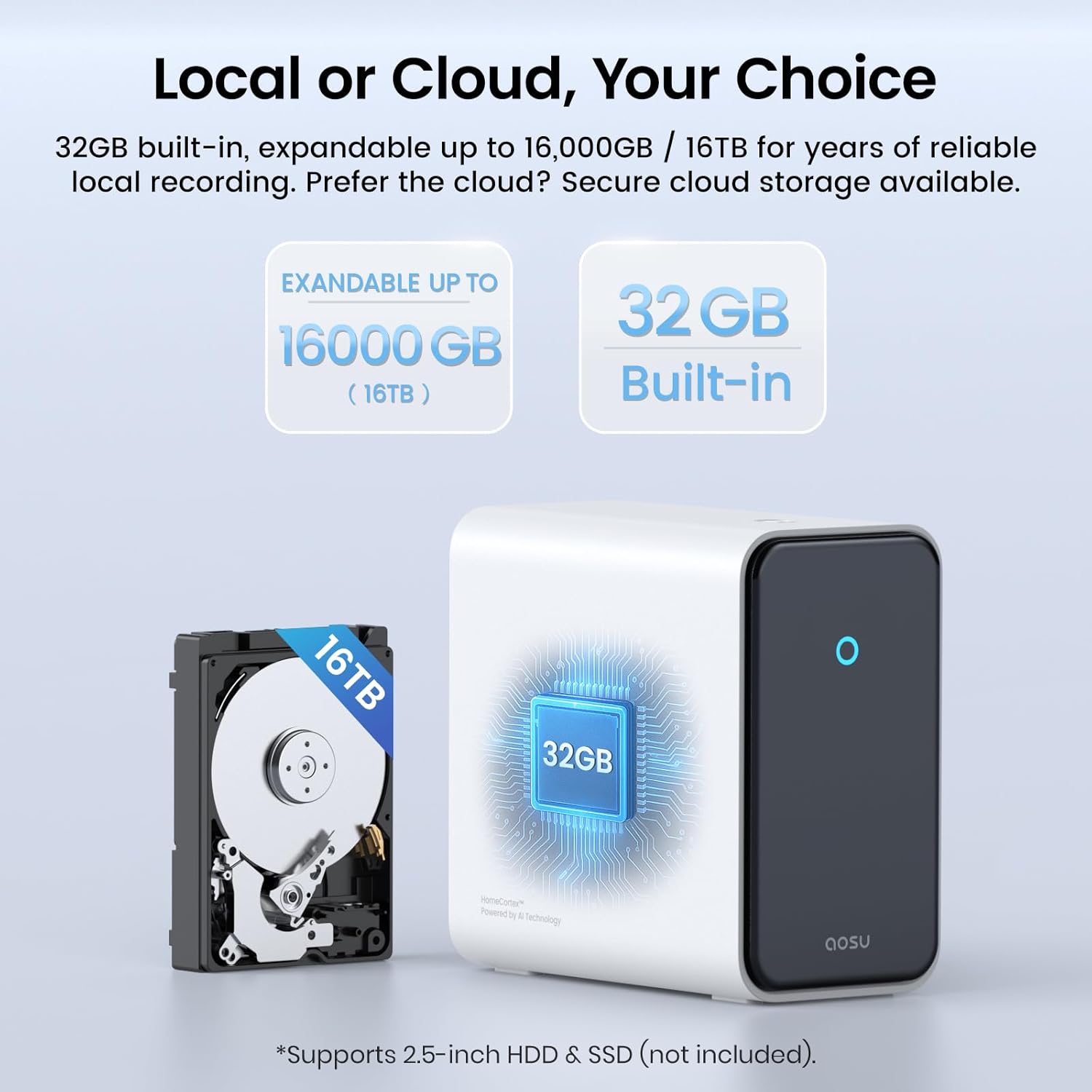 Built-in Local Storage — Secure & Expandable: aosu features 32GB of built-in storage (expandable up to 16TB), keeping your recordings private, encrypted, and fully under your control.