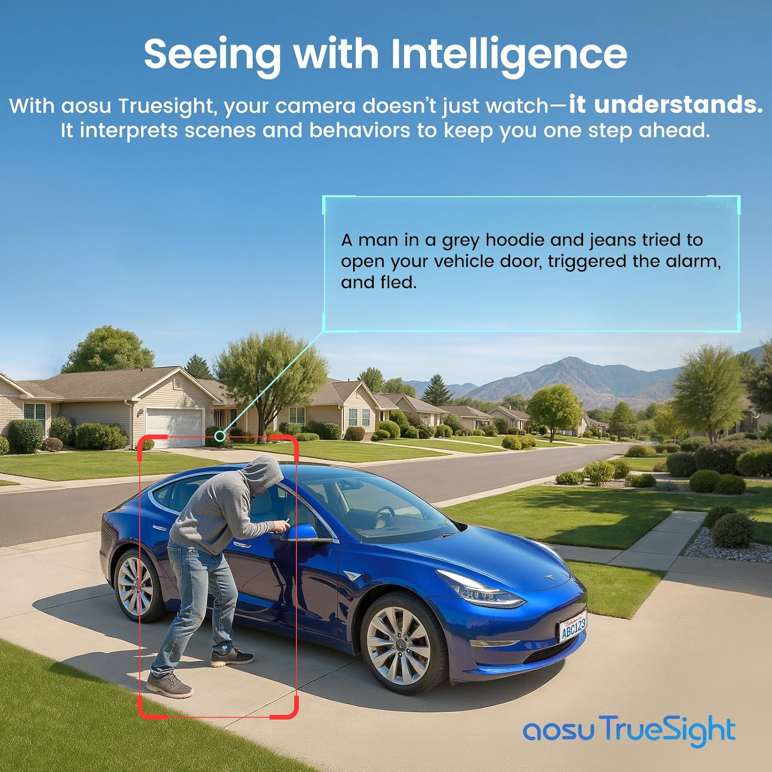aosu TrueSight — When Your Camera Truly Understands: TrueSight AI combines face recognition and behavior analysis to detect strangers—even in disguise—and recognize both familiar and unfamiliar vehicles. Suspicious behavior triggers instant alerts, while footage is AI-organized for quick, one-command searches—keeping you proactive and your home safer.