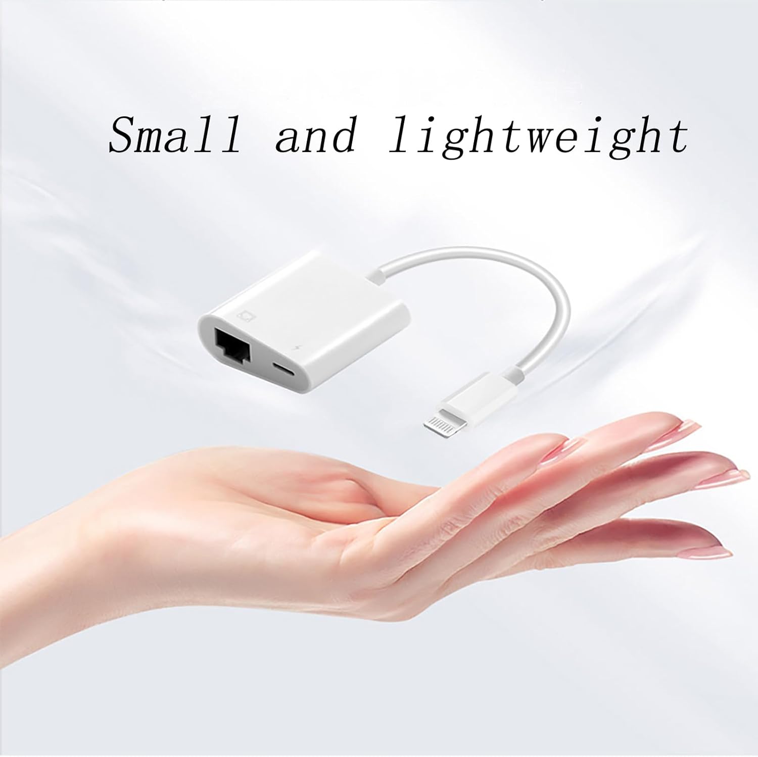【2 in 1 RJ45 Ethernet Adapter】This Lightning to RJ45 Ethernet LAN wired network port + charging port supports Internet access and charging at the same time. You can connect the network cable to your iPhone/iPad for wired network access, providing ultra-high-speed Internet access speed, allowing you to watch videos, play games or live broadcast connections more smoothly and get a smoother Internet experience