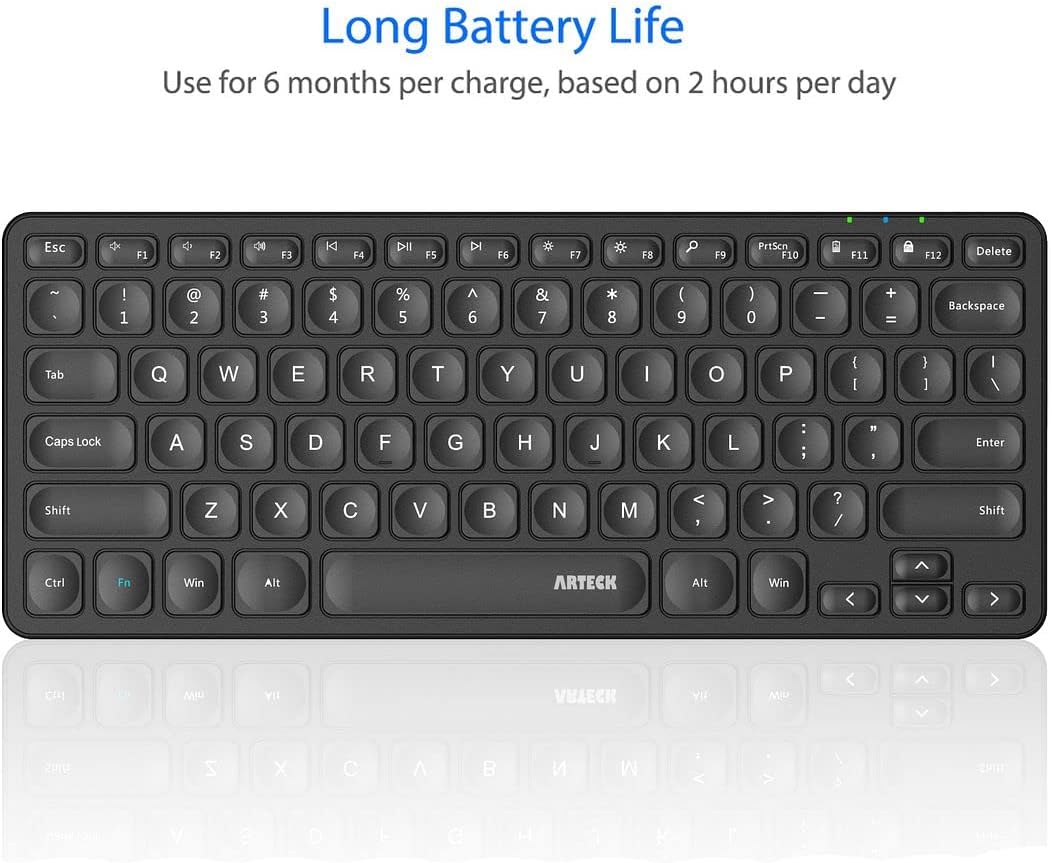 Package contents: Arteck 2.4G Wireless Keyboard, nano USB receiver, USB-C charging cable, welcome guide, our 24-month warranty and friendly customer service.