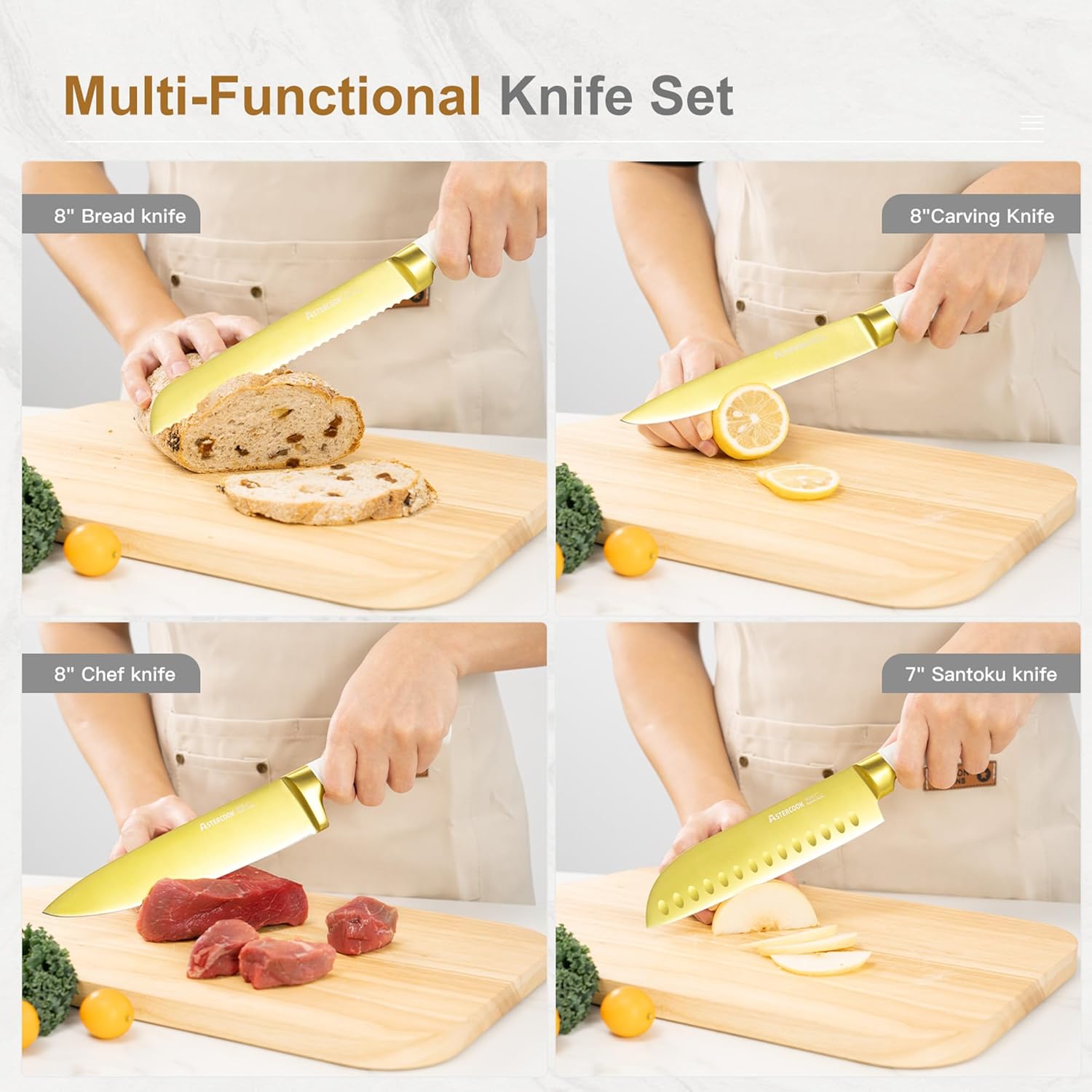 Sharp & Rust Resistant – Gold kitchen knife set uses a unique anti-rust, anti-stick and anti-oxidant teflon healthy gold titanium coating, so that the blade is always in the best condition, extremely easy to clean, greatly extending the life of the knife.