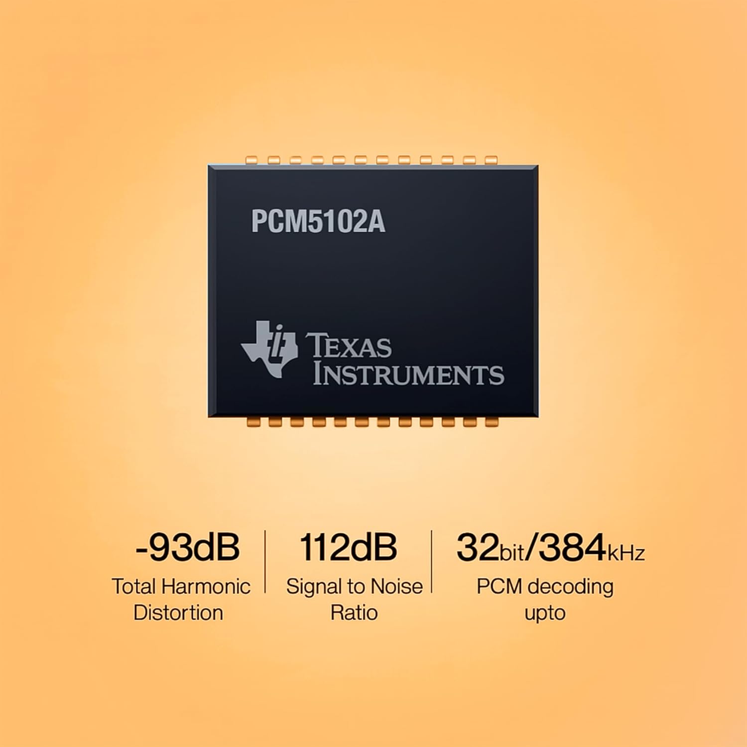 Equipped with the best in class true Hi-Fi 384kHz/32bit upsampling audiophile DAC – PCM5102A by TI that sports a high SNR of 112dB and is well regarded for its impressive low noise and low distortion characteristics. In short, this means that the sound you hear is crystal clear, rich and retains a wonderfully full dynamic range.