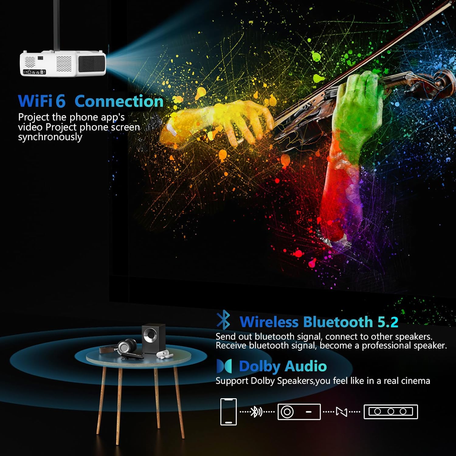 【Latest WiFi 6 Projector】Wi-Fi 6 is compatible with 2.4GHz and 5GHz networks, with the maximum rate up to 9.6G bps.Compared with the 5G network,it has three times faster speed, larger capacity for data transfer, and lower latency, which means our 4k projector with WiFi and Bluetooth can provide more stable and smoother transmission between devices and projector when used with a WiFi 6 router.Say goodbye to the lag and hello to uninterrupted wireless projection.