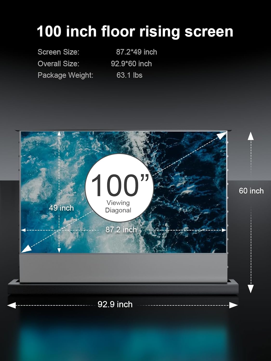 Intelligent control without Manual adjustments: Revolutionize your viewing experience with our smart control box featuring a memory function. Setting your desired floor-rising screen limit is a breeze. The motor and mechanism synchronize automatically Within 30 seconds in adjustment mode. Each time you raise the floor-rising screen, it effortlessly reaches your preset limit, adding a touch of luxury to your cinematic+ moments.