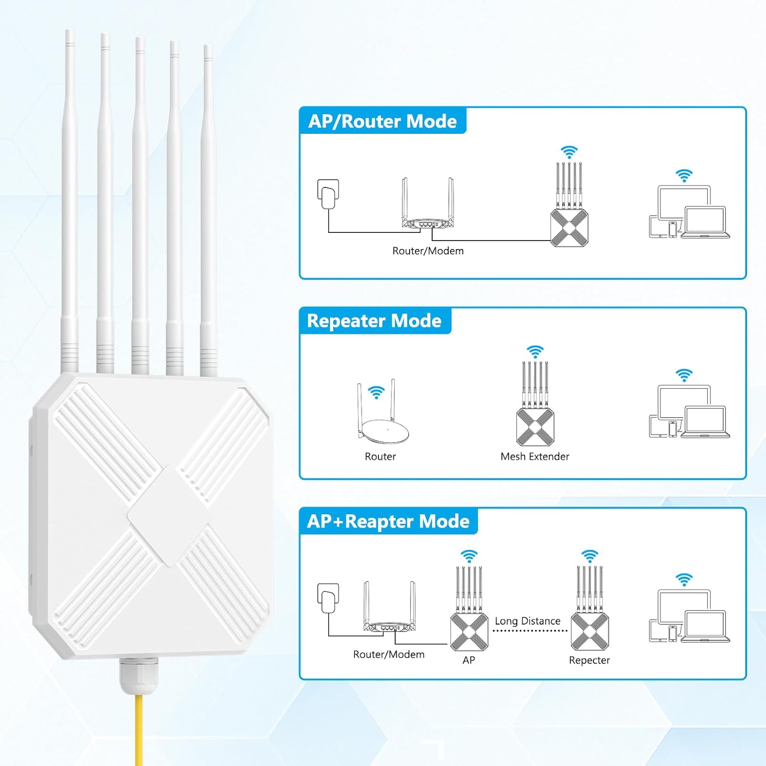 【Multi-Mode Versatility】Adapt to any scenario with AP, Router, Repeater, or Hybrid modes. Convert wired connections to wireless networks effortlessly—ideal for farms, RVs, warehouses, and outdoor events.