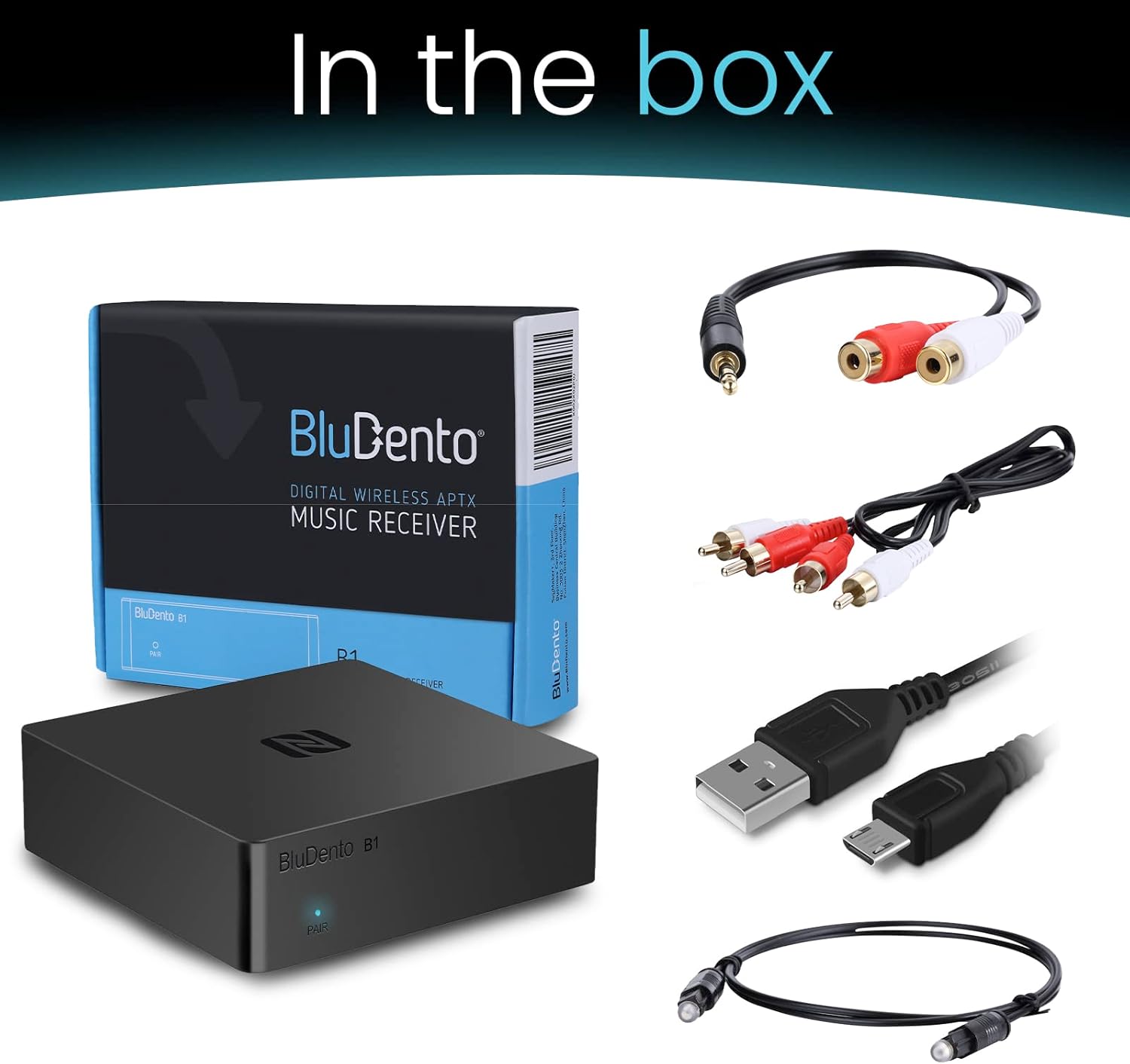 [WHAT’S IN THE BOX] 1. BluDento B1 x 1; 2. USB power cable x 1( DC 5V USB Power Adapter NOT INCLUDED ); 3. RCA audio cable x1; 4. Optical audio cable x 1; 5. RCA-3.5mm adapter x 1