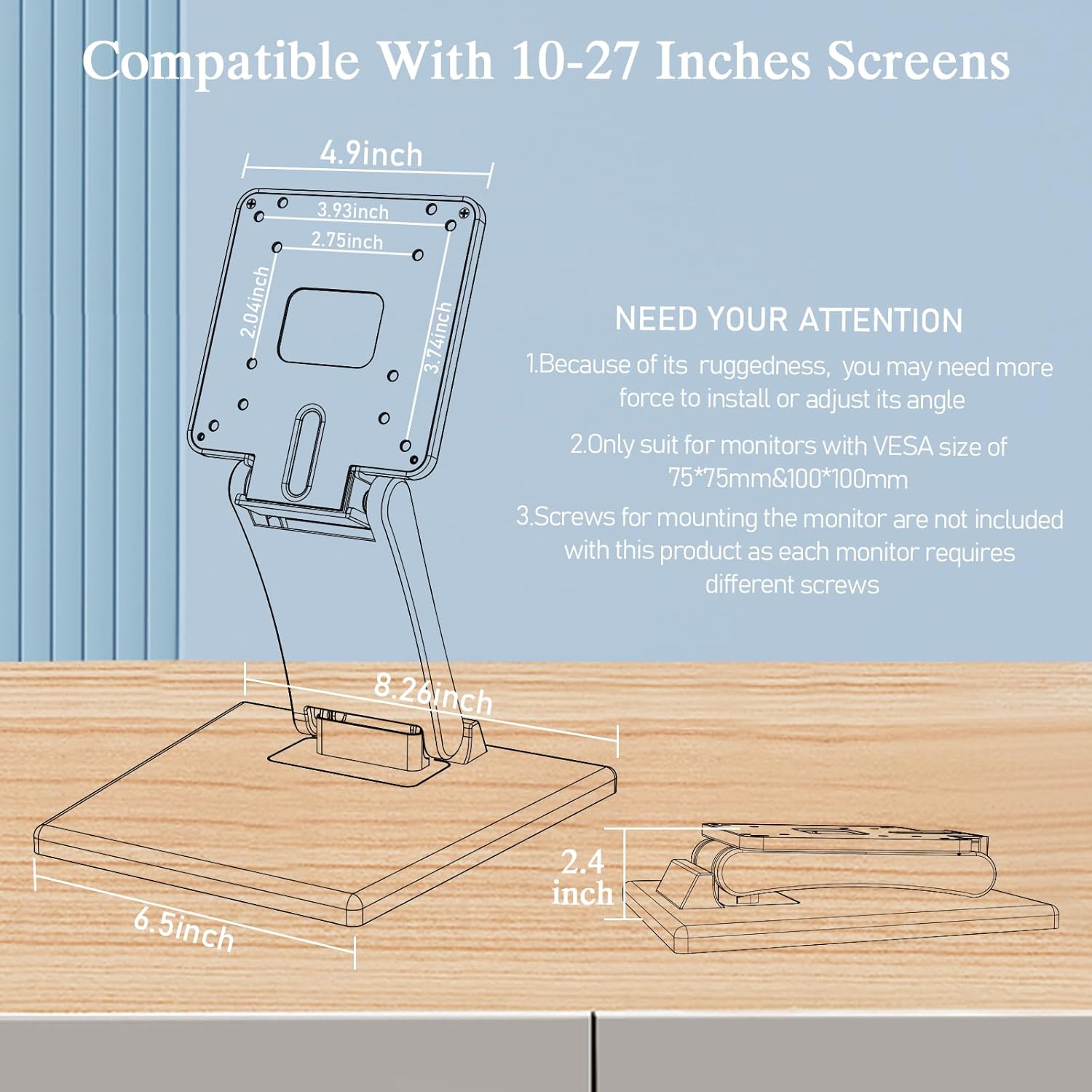 【VESA Monitor Mount Stand】Our vesa monitor stand suits for vesa compliant monitors with 75*75 or 100*100mm VESA HOLES. The vesa adapter could be adapted to 10-27 inches LCD monitors or other touch screen devices with vesa holes.