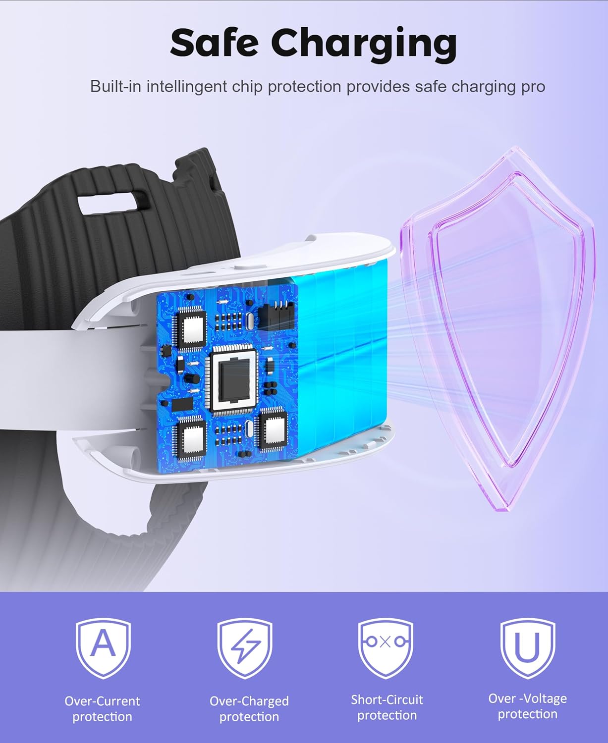 【10000mAh Battery – 6+ Hours Extra Playtime 】The built-in 10000mAh battery pack extends your Quest 2/3 runtime by 4-6 hours, eliminating low-power interruptions. Strategically placed to balance headset weight, it reduces facial pressure for long game sessions