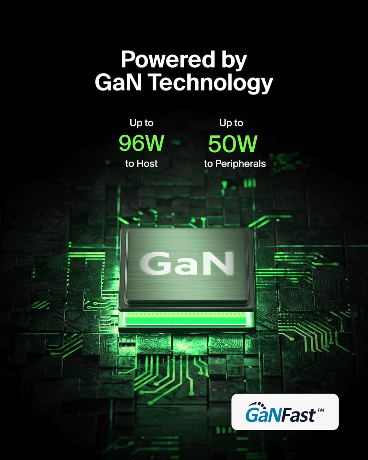 GaN TECHNOLOGY INTEGRATED: Get safe, efficient charging with GaN technology. This device delivers 146W Power Delivery for up to 96W to your host device and 50W to peripherals, ensuring optimal power distribution & high-speed performance for your devices.